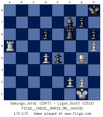 Last move : 1/2-1/2 2025 December 1 17:55:57 [Event "FICGS__CHESS__RAPID_SM__000032"] [Site "FICGS"] [Date "2025.11.03"] [Round "1"] [White "Domingo,Jordi"] [Black "Ligon,Scott"] [Result "1/2-1/2"] [WhiteElo "2307"] [BlackElo "2313"] 1.e4 c5 2.Nf3 Nc6 3.d4 cxd4 4.Nxd4 Nf6 5.Nc3 e5 6.Ndb5 d6 7.Bg5 a6 8.Na3 b5 9.Nd5 Be7 10.Bxf6 Bxf6 11.c3 Bg5 12.h4 Bh6 13.Nc2 O-O 14.a4 bxa4 15.Rxa4 a5 16.Nce3 Rb8 17.b3 Bxe3 18.Nxe3 Ne7 19.Bc4 Kh8 20.h5 h6 21.O-O f5 22.exf5 Nxf5 23.Nxf5 Rxf5 24.Bd5 Rf8 25.b4 axb4 26.Rxb4 Bf5 27.Qd2 Qf6 28.Rxb8 Rxb8 29.Bf3 Rf8 30.Ra1 e4 31.Be2 Be6 32.Qd4 Qxd4 33.cxd4 Rf6 34.Ra6 Bd5 35.Ra5 Bf7 36.Bg4 1/2-1/2 Follow this game move after move (download)Good offense and good defense both begin with good development. (Bruce A. Moon) Schach ist ein Kampf gegen den Fehler. (Johannes Herrman Zukertort) Es muy difícil jugar en contra de la teoría de Einstein. - en su primera derrota en contra de Fischer (Mikhail Tal) Les réformistes prétendent que les progrès de la théorie conduiront à la disparition des échecs, et qu'il faut, pour leur rendre vie, en remanier les règles. En réalité, qu'exprime cette affirmation? Le mépris de l'intuition, de l'imagination et de tous les autres éléments qui font des échecs un art. (Alexander Alekhine) There is a great deal of difference between an eager man who wants to read a book and a tired man who wants a book to read. (G.K. Chesterton)