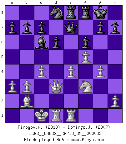 Last move : Qd2 2026 February 2 16:12:58 White clock - 26 days 06:26:04 Black clock - 33 days 07:33:35 [Event "FICGS__CHESS__RAPID_SM__000032"] [Site "FICGS"] [Date "2025.11.03"] [Round "1"] [White "Pirogov,Andrey Mikhaylovich"] [Black "Domingo,Jordi"] [Result "*"] [WhiteElo "2318"] [BlackElo "2307"] 1.d4 Nf6 2.c4 e5 3.dxe5 Ng4 4.e4 Nxe5 5.f4 Nec6 6.Nc3 Bc5 7.Qg4 Bd4 8.Qg3 Bxc3+ 9.Qxc3 O-O 10.b3 Qe7 11.Bd3 Na6 12.Bb2 f6 13.O-O-O Nc5 14.a3 d6 15.Nf3 Nxd3+ 16.Qxd3 Bd7 17.Rhe1 Rae8 18.f5 Nd8 19.g4 Bc6 20.Nd2 Nf7 21.Re3 a6 22.Rg1 Ne5 23.Qe2 b5 24.Reg3 g5 25.h4 gxh4 26.R3g2 h6 27.cxb5 axb5 28.Rh1 Rf7 29.Rxh4 Rh7 30.Rgh2 Kg7 31.g5 fxg5 32.R4h3 Qf6 33.Nf3 Re7 34.Kb1 Kg8 35.Ka2 Be8 36.Qd2 * Follow this game move after move (download)I believe that Chess possesses a magic that is also a help in advanced age. A rheumatic knee is forgotten during a game of Chess and other events can seem quite unimportant in comparison with a catastrophe on the chessboard. (Vlastimil Hort) Frage: Was machen Sie mit den Preisen? Anwort: Ich habe Angst, dass meine Freundin davon neue Kleider kauft. (Loek van Wely) Uno por uno, yo los acribillé, mi superioridad muy pronto se volvio aparente. (Jose Capablanca) Vouloir jouer aux échecs contre soi-même est aussi paradoxal que vouloir marcher sur son ombre. (Stefan Zweig) Begin at the beginning and go on till you come to the end; then stop. (Lewis Carrol, Alice in Wonderland)