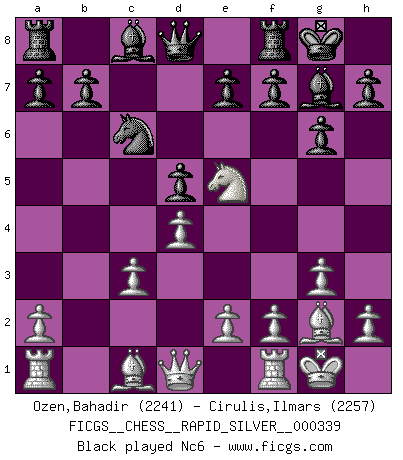Last move : 1/2-1/2 2025 November 11 12:18:8 [Event "FICGS__CHESS__RAPID_SILVER__000339"] [Site "FICGS"] [Date "2025.11.04"] [Round "1"] [White "Ozen,Bahadir"] [Black "Cirulis,Ilmars"] [Result "1/2-1/2"] [WhiteElo "2241"] [BlackElo "2257"] 1.d4 Nf6 2.c4 g6 3.g3 c6 4.Bg2 d5 5.cxd5 cxd5 6.Nf3 Bg7 7.O-O O-O 8.Nc3 Ne4 9.Ne5 Nxc3 10.bxc3 Nc6 11.Nxc6 bxc6 12.Qa4 Qb6 13.Ba3 Qa6 14.Qxa6 Bxa6 15.Rfb1 Bxe2 16.Bxe7 Rfb8 17.Bd6 Rxb1+ 18.Rxb1 Bd3 19.Rb8+ Rxb8 20.Bxb8 1/2-1/2 Follow this game move after move (download)Not only will I predict his triumph over Botvinnik, but I'll go further and say that he'll probably be the greatest Chess player that ever lived. (John Collins) Der beste Spieler in einem Turnier gewinnt es nie. Er landet auf Platz zwei oder drei. (Siegbert Tarrasch) El Ajedrez tiene tanto misterio como las mujeres. (Purdy) Echiquier : carré parfait, comme la Jérusalem nouvelle décrite par l'auteur de l'Apocalypse, huit cases sur huit, exaltation du chiffre 4, symbole du cosmos aux quatre horizons... où le noir et le blanc, l'ombre et la lumière, le mal et le bien s'entremêlent et se conjuguent. (Robert Couffignal, Le Gambit du poète) Pushing plastic is for the many, pushing virtual pieces is for the fewer, pushing wood is for the very few. (Normajean Yates)