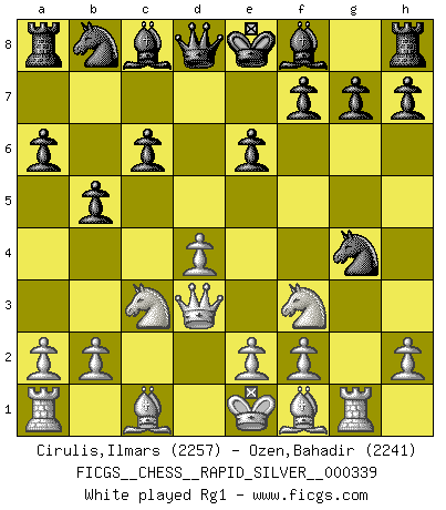 Last move : 1/2-1/2 2025 November 17 8:9:19 [Event "FICGS__CHESS__RAPID_SILVER__000339"] [Site "FICGS"] [Date "2025.11.04"] [Round "2"] [White "Cirulis,Ilmars"] [Black "Ozen,Bahadir"] [Result "1/2-1/2"] [WhiteElo "2257"] [BlackElo "2241"] 1.d4 d5 2.Nf3 Nf6 3.c4 e6 4.Nc3 c6 5.Qd3 dxc4 6.Qxc4 b5 7.Qd3 a6 8.g4 Nxg4 9.Rg1 Nf6 10.Bf4 Bb7 11.e4 Nbd7 12.O-O-O Be7 13.e5 Nh5 14.Bg5 c5 15.Qe3 cxd4 16.Rxd4 g6 17.Be2 Rc8 18.Kb1 Ng7 19.Rgd1 Bc6 20.Bd3 b4 21.Rxd7 Qxd7 22.Bxa6 Bxg5 23.Nxg5 Nf5 24.Rxd7 Nxe3 25.Rxf7 Rb8 26.Rc7 bxc3 27.Rxc6 Rxb2+ 28.Kc1 Rc2+ 29.Kb1 1/2-1/2 Follow this game move after move (download)In a gambit you give up a Pawn for the sake of getting a lost game. (Samuel Standige Boden) Kritik überlasse ich den Spießern. Ich zeige nichts, wofür ich mich schämen muss. (Alexandra Kosteniuk) El Ajedrez expande y enriquece tu mente. (Saudin Robovic) Les écrivains ont utilisé les échecs pour analyser les côtés extrêmes de la nature humaine. Dans ce cadre, les échecs offrent un champ d'expérimentation idéal. Mais on pourrait faire la même chose avec la peinture. Et là, en vous référant à Van Gogh, vous ne tirerez pas de conclusion définitive sur les peintres. (Gary Kasparov) Life is verb, not a noun. (Charlotte Perkins Gilman)