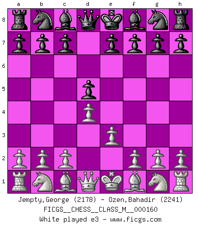 Last move : 1/2-1/2 2025 December 6 18:17:47 [Event "FICGS__CHESS__CLASS_M__000160"] [Site "FICGS"] [Date "2025.11.04"] [Round "1"] [White "Jempty,George"] [Black "Ozen,Bahadir"] [Result "1/2-1/2"] [WhiteElo "2178"] [BlackElo "2241"] 1.d4 d5 2.e3 Nf6 3.Nf3 e6 4.Bd3 b6 5.O-O Bb7 6.c4 dxc4 7.Bxc4 a6 8.b3 Nbd7 9.Bb2 Be7 10.Nbd2 O-O 11.Rc1 c5 12.dxc5 Nxc5 13.Qc2 b5 14.Be2 Rc8 15.Qb1 Nce4 16.Rxc8 Qxc8 17.Rc1 Nxd2 18.Nxd2 Qa8 19.Bf3 Rd8 20.Bxb7 Qxb7 21.Nf3 Nd5 1/2-1/2 Follow this game move after move (download)I like to say that Bobby Fischer was the greatest player ever. But what made Fischer a genius was his ability to blend an American freshness and pragmatism with Russian ideas about strategy. (Bruce Pandolfini) Jeder Schachmeister war einmal ein Anfänger. (Irving Chernev) La señal de un Gran Maestro es su habilidad de ganar una partida rápidamente y sin dolor. (Irving Chernev) La solitude du joueur d'Echecs à l'approche du mat est semblable à celle du condamné. (Francis Szpiner) The weakness of an artist is dogma. (Josh Waitzkin)