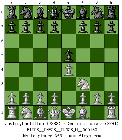 Last move : 1/2-1/2 2026 January 28 21:16:43 [Event "FICGS__CHESS__CLASS_M__000160"] [Site "FICGS"] [Date "2025.11.04"] [Round "1"] [White "Javier,Christian"] [Black "Swiatek,Janusz"] [Result "1/2-1/2"] [WhiteElo "2282"] [BlackElo "2291"] 1.e4 e5 2.Nf3 Nc6 3.Bc4 Nf6 4.d3 Bc5 5.c3 d6 6.O-O a6 7.a4 O-O 8.h3 h6 9.Re1 a5 10.d4 Bb6 11.Bb5 Bd7 12.Be3 exd4 13.cxd4 Re8 14.d5 Bxe3 15.Rxe3 Nb4 16.Bxd7 Qxd7 17.Nc3 c6 18.dxc6 bxc6 19.Qd2 Rad8 20.Rae1 d5 21.exd5 Rxe3 22.Rxe3 Nfxd5 23.Re1 Nxc3 24.Qxc3 Qd6 25.b3 Qd3 26.Qe5 Qd5 27.Rc1 c5 28.Rxc5 Qd1+ 29.Qe1 Qxb3 1/2-1/2 Follow this game move after move (download)No price is too great for the scalp of the enemy King. (Koblentz) Schon mancher Spieler hat aufgegeben, um zu vermeiden, daß er eine Figur verliert. (Savielly Grigorievitsch Tartakower) El jugador táctico sabe que hacer cuando hay algo que hacer; mientras que el estratega sabe que hacer cuando no hay nada que hacer. (Gerald Abrahams) 'L'échange des dames est un coup dur pour les deux adversaires...' Un journaliste lors d'une partie du match Spassky-Fischer I fear not the man who has practiced 10,000 kicks once, but I fear the man who has practiced one kick 10,000 times. (Bruce Lee)