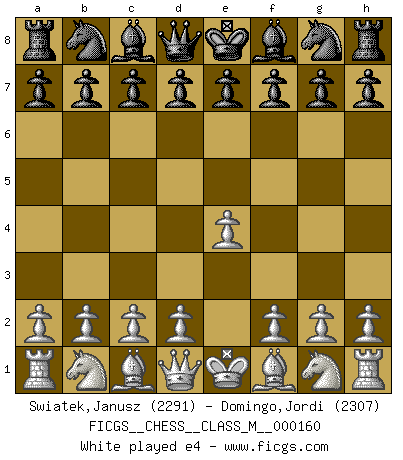 Last move : 1/2-1/2 2026 January 4 16:12:52 [Event "FICGS__CHESS__CLASS_M__000160"] [Site "FICGS"] [Date "2025.11.04"] [Round "1"] [White "Swiatek,Janusz"] [Black "Domingo,Jordi"] [Result "1/2-1/2"] [WhiteElo "2291"] [BlackElo "2307"] 1.e4 e5 2.Nf3 Nc6 3.Bb5 f5 4.Nc3 fxe4 5.Nxe4 d5 6.Nxe5 dxe4 7.Nxc6 Qg5 8.Qe2 Nf6 9.Nxa7 Bd7 10.Bxd7+ Nxd7 11.f4 Qf5 12.Nb5 O-O-O 13.b3 Qf6 14.Rb1 Qxf4 15.d4 e3 16.Bxe3 Qf5 17.Rf1 Qg6 18.b4 Bd6 19.Nxd6+ Qxd6 20.h3 Nf6 21.Rb3 Rhe8 22.Rf5 Nd5 23.Re5 Rxe5 24.dxe5 Qxe5 25.Bd2 Qa1+ 26.Kf2 Nf6 27.Bc3 Qc1 28.Bb2 Qf4+ 29.Qf3 Qd2+ 30.Kg1 Qxc2 31.Kh2 Qd1 32.Qf5+ Qd7 33.Qg5 Re8 34.Be5 b6 35.Rf3 h6 36.Qf5 1/2-1/2 Follow this game move after move (download)Chess is like life. (Boris Spassky) Ja, ich habe einmal eine Blitzpartie gespielt, es war in einem Zug, 1929. --im Interview 1989 (Mikhail Moiseyevich Botvinik) Si tu oponente te ofrece un empate, trata de averiguar porque piensa él que esta en una posición peor. (Nigel Short) On entre au jeu d'Echecs comme on entre en Religion. Pour le joueur d'Echecs, la partie d'Echecs c'est l'office, la messe, le défilé du 1er Mai, le dépôt de gerbe au Monument aux Morts. C'est un drame sacré. (Michel Roos) Vladimir Ras-Putin is still alive... He is also a good actor, I saw him in the Lord of the Rings. (Rodolfo d'Ettorre)