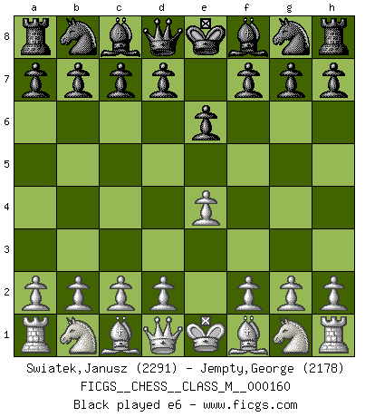 Last move : 1/2-1/2 2026 January 24 5:46:41 [Event "FICGS__CHESS__CLASS_M__000160"] [Site "FICGS"] [Date "2025.11.04"] [Round "1"] [White "Swiatek,Janusz"] [Black "Jempty,George"] [Result "1/2-1/2"] [WhiteElo "2291"] [BlackElo "2178"] 1.e4 e6 2.d4 d5 3.Nc3 dxe4 4.Nxe4 Nd7 5.Nf3 Ngf6 6.Nxf6+ Nxf6 7.Be3 Bd7 8.Bd3 Nd5 9.Bd2 c5 10.O-O cxd4 11.Nxd4 Bc5 12.Qg4 Nf6 13.Qh4 Nd5 14.Qe4 Nf6 15.Qe5 Qe7 16.Rfe1 Qd6 17.Qxd6 Bxd6 18.Nf5 Bf8 19.a4 O-O-O 20.Ne3 Bc6 21.Nc4 Nd5 22.a5 Bb4 23.c3 Be7 24.a6 b6 25.Ne5 Be8 26.Nf3 Nxc3 27.Bxc3 Rxd3 28.Rec1 Kd8 29.Bd4 Bc5 30.Bxg7 Rg8 31.Bf6+ Be7 32.Bd4 Bc5 33.Bf6+ Be7 34.Rd1 Rd7 35.Bc3 f6 36.Nd4 e5 37.Nc6+ Kc7 38.Nxe7 Rxe7 1/2-1/2 Follow this game move after move (download)It is difficult to play against Einstein's theory --on his first loss to Fischer. (Mikhail Tal) Die FIDE ist dabei in die Hände der russischen Mafia zu fallen. (Larry Evans) No es tiempo de jugar al Ajedrez cuando la casa esta en llamas. (Proverbio Italiano) Les Echecs, c'est l'art de la guerre sans les charniers, c'est la résurrection des morts tombés au champ d'honneur, l'espoir perpétuel, la suprématie de l'intelligence sur la force, la culture de l'esprit. (F. Szpiner) Bobby never cared about money, though. His only desire was to prove that his choices were correct: He wanted chess to be important because he was a chess player, and he wanted to be important. Bobby knew money was important, but he didn't have a clue why, outside of clothes and status. The only way he could accomplish what he wanted was to fight for a lot of money. Once he got it, he gave it away. He did not know how to spend it. And once he'd become champion, after, essentially, sacrificing his life for it, he didn't know how to spend his time. (Bob Wade)