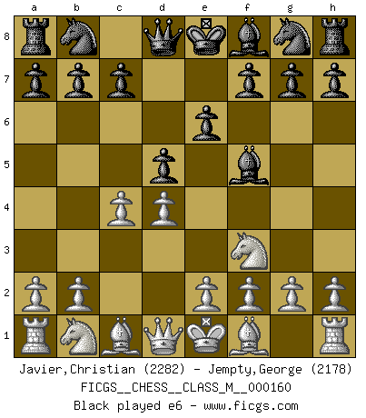 Last move : 1/2-1/2 2026 January 4 11:20:26 [Event "FICGS__CHESS__CLASS_M__000160"] [Site "FICGS"] [Date "2025.11.04"] [Round "1"] [White "Javier,Christian"] [Black "Jempty,George"] [Result "1/2-1/2"] [WhiteElo "2282"] [BlackElo "2178"] 1.Nf3 d5 2.d4 Bf5 3.c4 e6 4.Nc3 Nf6 5.Nh4 Bb4 6.cxd5 Qxd5 7.e3 O-O 8.Bd2 Qd7 9.Qb3 Nc6 10.Be2 Rab8 11.O-O a6 12.Rac1 Bd6 13.a3 Rfe8 14.Rfd1 h6 15.Nxf5 exf5 16.Bf3 Ne7 17.g3 c6 18.h4 Rbd8 19.Be1 g6 20.e4 Nxe4 21.Nxe4 fxe4 22.Bxe4 Bb8 23.Qf3 Qh3 1/2-1/2 Follow this game move after move (download)Every Chess master was once a beginner. (Chernev) Frage: Was machen Sie mit den Preisen? Anwort: Ich habe Angst, dass meine Freundin davon neue Kleider kauft. (Loek van Wely) Aunque la mayoría de la gente disfruta observar las partidas de los grandes Maestros de ataque, algunos de los jugadores mas notables en la historia han sido los jugadores silenciosos posicionales. Lentamente ellos te aplastan despojandote de tu espacio, congestionando tus piezas y dejandote virtualmente sin nada que hacer. (Yasser Seirawan) Les erreurs sont comme les malheurs, elles n'arrivent jamais seules. (Siegbert Tarrasch) Hello Thibault, if I have had a plan (and I had one, I hope), I have forgotten it during the last week... - Hello Heinz-Georg. What do you mean a plan ? (Anonymous players, during a Big Chess game)