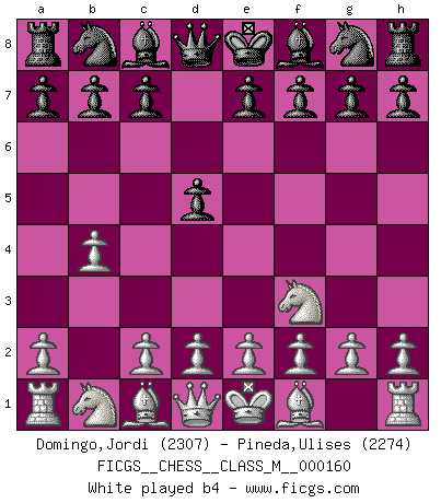 Last move : 1/2-1/2 2025 December 19 7:18:24 [Event "FICGS__CHESS__CLASS_M__000160"] [Site "FICGS"] [Date "2025.11.04"] [Round "1"] [White "Domingo,Jordi"] [Black "Pineda,Ulises"] [Result "1/2-1/2"] [WhiteElo "2307"] [BlackElo "2274"] 1.Nf3 d5 2.b4 Nf6 3.Bb2 e5 4.Nxe5 Bxb4 5.c4 O-O 6.cxd5 Re8 7.e3 Nxd5 8.Be2 Bf5 9.O-O Nd7 10.Nxd7 Qxd7 11.Nc3 Nxc3 12.Bxc3 Bxc3 13.dxc3 Qc6 14.Qb3 Be4 15.f3 Bd5 16.c4 Be6 17.Qb5 Qd6 18.Rfd1 Qa3 19.Qb3 Qc5 20.Rd4 Rab8 21.Qd3 g6 22.Rd1 a5 23.h3 a4 24.Qd2 Qe7 25.e4 c6 26.f4 b5 27.cxb5 cxb5 28.f5 Bxf5 29.Bxb5 Rxb5 30.exf5 Rxf5 31.Rxa4 Kg7 32.Qc3+ Qe5 33.Qxe5+ 1/2-1/2 Follow this game move after move (download)You can only get good at Chess if you love the game. (Bobby Fischer) Schach ist ein Reich, wo sich die menschliche Phantasie frei entfalten kann. (David Bronstein) Fischer es el jugador mas fuerte del mundo. De hecho, el jugador mas fuerte que jamas haya existido. (Larry Evans) Que feriez-vous si vous étiez en train de jouer aux échecs et que la fin du monde arrive ? Je continuerais à jouer. (Saint Borromée) A clear conscience is usually the sign of a bad memory. (Unknown)