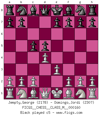Last move : 1/2-1/2 2025 December 29 22:52:59 [Event "FICGS__CHESS__CLASS_M__000160"] [Site "FICGS"] [Date "2025.11.04"] [Round "1"] [White "Jempty,George"] [Black "Domingo,Jordi"] [Result "1/2-1/2"] [WhiteElo "2178"] [BlackElo "2307"] 1.d4 d5 2.e3 c5 3.dxc5 e6 4.c4 Bxc5 5.cxd5 exd5 6.Nc3 Nf6 7.Nf3 Nc6 8.Be2 O-O 9.a3 Bf5 10.O-O a6 11.b4 d4 12.Na4 Ba7 13.exd4 Bxd4 14.Bb2 Bxb2 15.Nxb2 Re8 16.Qxd8 Raxd8 17.Rfe1 g6 18.Na4 a5 19.bxa5 Nxa5 20.Nc3 Nd5 21.Nxd5 Rxd5 22.Bf1 Rc8 23.Rac1 Bc2 24.Re3 Rdc5 25.Be2 Nb3 26.Re1 Kf8 27.Bf1 Na5 28.Nd4 Ba4 29.g3 Nc4 30.Bxc4 Rxc4 31.Nf3 h5 32.Re7 R8c7 33.Rxc7 Rxc7 34.Rb1 Bc6 35.Rc1 1/2-1/2 Follow this game move after move (download)I'm not a materialistic person, in that, I don't suffer the lack or loss of money. The absence of worldly goods I don't look back on. For Chess is a way I can be as materialistic as I want without having to sell my soul. (Jamie Walter Adams) Im Wettkampf zwischen starken Meistern kommen Fehler sehr selten vor, deshalb ist es mit bloßem Warten nicht getan. (José Raúl Capablanca) No volvere nunca a jugar contigo. Has insultado a mi amigo. - cuando un oponente se maldijo por una mala jugada (Miguel Najdorf) Demandez au pauvre Cg1 ce qu'il en pense. Eduard Gufeld à propos de la variante Saemisch de l'Est-Indienne. It is not enough to be a good player... you must also play well. (Siegbert Tarrasch)