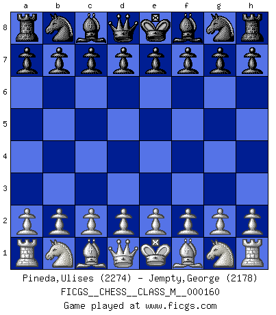 Last move : gxf6 2026 January 29 1:44:1 George Jempty ... is in vacation until 2026 March 14 22:11:31 White clock - 90 days 11:32:35 Black clock - 99 days 09:43:43 (54 days 06:21:43) [Event "FICGS__CHESS__CLASS_M__000160"] [Site "FICGS"] [Date "2025.11.04"] [Round "1"] [White "Pineda,Ulises"] [Black "Jempty,George"] [Result "*"] [WhiteElo "2274"] [BlackElo "2178"] 1.e4 e5 2.Nf3 Nc6 3.Bb5 a6 4.Ba4 d6 5.O-O b5 6.Bb3 Na5 7.d4 exd4 8.Re1 Nxb3 9.axb3 c5 10.c3 Bb7 11.cxd4 Nf6 12.Nc3 Be7 13.Nh4 b4 14.Nd5 Nxd5 15.Nf5 O-O 16.exd5 Re8 17.Bf4 Bf8 18.dxc5 Rxe1+ 19.Qxe1 dxc5 20.d6 Qd7 21.Ne7+ Bxe7 22.Qxe7 Qxe7 23.dxe7 f6 24.Bd6 Kf7 25.Bxc5 a5 26.f3 Ke8 27.Kf2 Bd5 28.g4 Bxb3 29.Bxb4 Ra7 30.Bc5 Ra8 31.Ke3 Bd5 32.g5 Bc6 33.gxf6 * Follow this game move after move (download)Some sacrifices are sound; the rest are mine. (Mikhail Tal) Ein unbeabsichtigtes Patt ist der Gipfel der Dummheit. (Anonymous) Una de estas pequeñas movidas modestas pudieran ser mas molestas a tu oponente que la amenaza mas grande. (Siegbert Tarrasch) Il a essayé de se convaincre qu'il pourrait empêcher toutes les erreurs et ne jamais perdre. L'horreur ! Gary Kasparov au sujet de Robert Fischer. The problem with manipulation is that people can turn on you. (Horatio Caine, C.S.I. Miami)