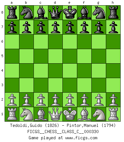 Last move : fxg5 2026 February 5 11:9:57 White clock - 42 days 23:10:45 Black clock - 99 days 11:47:54 (59 days 20:16:20) [Event "FICGS__CHESS__CLASS_C__000330"] [Site "FICGS"] [Date "2025.11.05"] [Round "1"] [White "Tedoldi,Guido"] [Black "Pintor,Manuel"] [Result "*"] [WhiteElo "1826"] [BlackElo "1794"] 1.c4 e5 2.Nc3 Nf6 3.d3 Bc5 4.Nf3 d6 5.h3 O-O 6.e3 Nc6 7.Be2 Ne7 8.O-O h6 9.Na4 Bb6 10.Bd2 a6 11.Nxb6 cxb6 12.e4 Nc6 13.Bc3 Nh7 14.Rc1 Ng5 15.b4 Nxf3+ 16.Bxf3 Qf6 17.Bg4 Qg5 18.Bxc8 Raxc8 19.Qg4 Qxg4 20.hxg4 g6 21.a4 Kh7 22.f4 Nd4 23.Bxd4 exd4 24.Rf2 g5 25.fxg5 * Follow this game move after move (download)The Pin is mightier than the sword. (Fred Reinfeld) Das Schach hält seine Meister in eigenen Banden, Fesseln; auf vielerlei Weise formt es ihren Geist, so dass die innere Freiheit selbst des Stärksten beeinflusst wird. (Albert Einstein) El Ajedrez se juega con la mente... ¡no con las manos!. (Renaud y Kahn) Avant la finale, les dieux ont créé le milieu de partie. (Tarrasch) May the force be with you. (Han Solo in Star Wars ep.4)