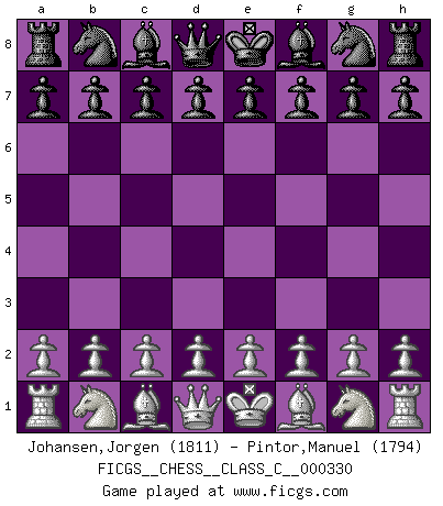 Last move : 0-1 2025 December 15 19:8:31 [Event "FICGS__CHESS__CLASS_C__000330"] [Site "FICGS"] [Date "2025.11.05"] [Round "1"] [White "Johansen,Jorgen"] [Black "Pintor,Manuel"] [Result "0-1"] [WhiteElo "1811"] [BlackElo "1794"] 0-1 This chess game has been lost on time (started : 2025.11.05 13:13:31) Follow this game move after move (download)Chess is above all, a fight ! (Emanuel Lasker) Das Schach ist nichts für kleine Geister, es beansprucht einen vollen Mann, der sich nicht sklavisch an das Überlieferte hält, sondern selbständig die Tiefen des Spiels zu ergründen sucht. (Wilhelm Steinitz) Me gusta decir que Bobby Fischer fue el mejor jugador que jamás haya existido. Pero lo que hizo de Fischer un genio, fue su habilidad de mezclar una frescura y pragmatismo Americano con ideas Rusas acerca de la estrategia. (Bruce Pandolfini) Les Echecs ont trois composantes : le temps, l'espace et le matériel en dernier. (Mikhail Tal) Convictions are more dangerous enemies of truth than lies. (Friedrich Nietzsche)