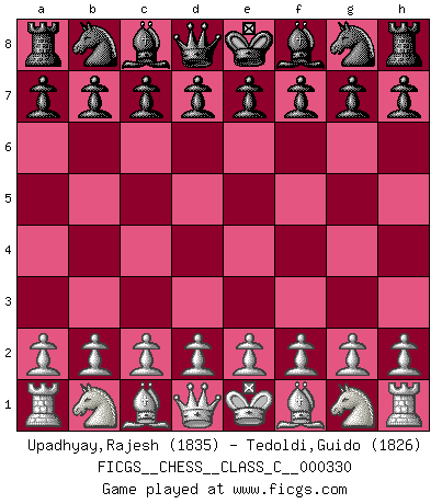 Last move : d6 2026 February 5 12:2:55 White clock - 98 days 03:04:12 Black clock - 42 days 22:22:19 [Event "FICGS__CHESS__CLASS_C__000330"] [Site "FICGS"] [Date "2025.11.05"] [Round "1"] [White "Upadhyay,Rajesh"] [Black "Tedoldi,Guido"] [Result "*"] [WhiteElo "1835"] [BlackElo "1826"] 1.c4 c5 2.Nf3 Nc6 3.e3 d6 4.d4 cxd4 5.exd4 e6 6.Nc3 h6 7.d5 Ne5 8.Be2 Nxf3+ 9.Bxf3 e5 10.O-O Nf6 11.Re1 Be7 12.g3 Bh3 13.Bg2 Bxg2 14.Kxg2 Rc8 15.Qa4+ Nd7 16.Qxa7 Rxc4 17.Qxb7 h5 18.f4 h4 19.fxe5 h3+ 20.Kh1 Rc7 21.Qa6 Nxe5 22.Bf4 Bf6 23.Ne4 Be7 24.Bxe5 dxe5 25.d6 * Follow this game move after move (download)Chess books should be used as we use glasses: to assist the sight, although some players make use of them as if they thought they conferred sight. (Jose Raul Capablanca) Gegen einen Schachcomputer zu verlieren ist wie Löcher in den Strümpfen zuhaben. Es ist nicht peinlich, solange man der einzige ist der es weiß. (Anonymous) Debemos de asegurarnos de que el Ajedrez no se convierta en un lenguaje muerto, muy interesante, pero tan solo para un grupo muy pequeño. (Sytze Faber) Vouloir jouer aux échecs contre soi-même est aussi paradoxal que vouloir marcher sur son ombre. (Stefan Zweig) The only difference between a tax man and a taxidermist is that the taxidermist leaves the skin. (Mark Twain)