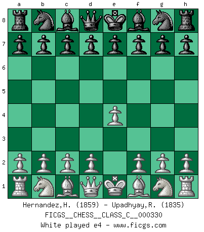 Last move : 1-0 2025 November 12 13:39:15 [Event "FICGS__CHESS__CLASS_C__000330"] [Site "FICGS"] [Date "2025.11.05"] [Round "1"] [White "Hernandez,Humberto"] [Black "Upadhyay,Rajesh"] [Result "1-0"] [WhiteElo "1859"] [BlackElo "1835"] 1.e4 1-0 Follow this game move after move (download)First-class players lose to second-class players because second-class players sometimes play a first-class game. (Siegbert Tarrasch) Jede Eröffnung ist gut genug um gespielt zu werden, wenn nur ihr Ruf schlecht genug ist. (Savielly Grigorievitsch Tartakower) Del Ajedrez se ha dicho que la vida no es lo suficientemente larga para él, pero eso es culpa de la vida, no del Ajedrez. (William Ewart Napier) Les Echecs, c'est l'art de la guerre sans les charniers, c'est la résurrection des morts tombés au champ d'honneur, l'espoir perpétuel, la suprématie de l'intelligence sur la force, la culture de l'esprit. (F. Szpiner) If you ain't just a little scared when you enter a casino, you are either very rich or you haven't studied the games enough. (Pappy)