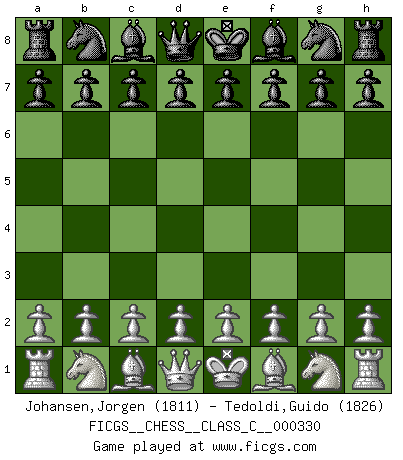 Last move : 0-1 2025 December 15 19:8:31 [Event "FICGS__CHESS__CLASS_C__000330"] [Site "FICGS"] [Date "2025.11.05"] [Round "1"] [White "Johansen,Jorgen"] [Black "Tedoldi,Guido"] [Result "0-1"] [WhiteElo "1811"] [BlackElo "1826"] 0-1 This chess game has been lost on time (started : 2025.11.05 13:13:31) Follow this game move after move (download)The passed pawn is a criminal, who should be kept under lock and key. Mild measures, such as police surveillance, are not sufficient. (Nimzovitch) Ich glaube, ich kenne inzwischen die Gründe für mein Versagen: schachliche Charakterfehler. Ich war nie ein Wunderkind und in meiner gesamten menschlichen Entwicklung immer zu langsam. (Viktor Kortschnoi) El Ajedrez es de 30 a 40 por ciento psicología. Uno no cuenta con esto cuando se juega contra una computadora. No lo puedo confundir. (Judith Polgar) Shah mat. Le roi est mort. Cri de fierté d'un joueur venant de terrasser son adversaire, courtoisement, sans effusion de sang. A good book on your shelf is a friend that turns its back on you and remains a friend. (Author unknown)