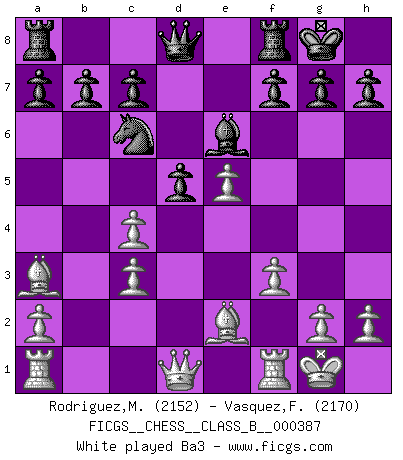 Last move : Rd1 2026 February 6 19:30:52 White clock - 97 days 05:44:55 Black clock - 46 days 08:22:42 [Event "FICGS__CHESS__CLASS_B__000387"] [Site "FICGS"] [Date "2025.11.09"] [Round "1"] [White "Rodriguez,Mariano"] [Black "Vasquez,Fernando"] [Result "*"] [WhiteElo "2152"] [BlackElo "2170"] 1.e4 e5 2.Nf3 Nf6 3.Nxe5 d6 4.Nf3 Nxe4 5.d4 d5 6.Bd3 Be7 7.O-O Nc6 8.c4 Nb4 9.Be2 O-O 10.Nc3 Be6 11.Ne5 Bd6 12.f3 Nxc3 13.bxc3 Bxe5 14.dxe5 Nc6 15.Ba3 Re8 16.f4 dxc4 17.Qe1 Qc8 18.h3 Rd8 19.Rf2 Rd5 20.Qf1 Ra5 21.Bb4 Nxb4 22.cxb4 Rb5 23.f5 Bd5 24.Bh5 Rxb4 25.Rd1 * Follow this game move after move (download)Up to this point White has been following well-known analysis. But now he makes a fatal error: he begins to use his own head. (Siegbert Tarrasch) Es gibt Leute, die glauben, alles wäre vernünftig, was man mit einem ernsthaften Gesicht tut. (Georg Christoph Lichtenberg) El Ajedrez expande y enriquece tu mente. (Saudin Robovic) Même un GMI sait rarement calculer sur plus de cinq coups une attaque à sacrifices. (Rudolf Spielmann) Luck is what you have left over after you give 100 percent. (Langston Coleman)