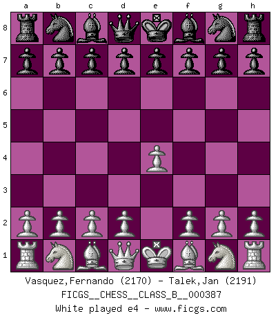 Last move : a6 2026 January 30 0:27:48 White clock - 46 days 13:50:28 Black clock - 99 days 05:21:12 [Event "FICGS__CHESS__CLASS_B__000387"] [Site "FICGS"] [Date "2025.11.09"] [Round "1"] [White "Vasquez,Fernando"] [Black "Talek,Jan"] [Result "*"] [WhiteElo "2170"] [BlackElo "2191"] 1.e4 Nf6 2.e5 Nd5 3.c4 Nb6 4.d4 d6 5.f4 dxe5 6.fxe5 Nc6 7.Be3 Bf5 8.Nc3 e6 9.Nf3 Be7 10.Be2 O-O 11.O-O f6 12.exf6 Bxf6 13.Qd2 Qe7 14.Rad1 Rad8 15.Kh1 Rd7 16.h3 h6 17.Qc1 Kh8 18.Bg1 Rfd8 19.c5 Nd5 20.Bb5 Ndb4 21.a3 a6 22.* Follow this game move after move (download)Combinations have always been the most intriguing aspect of Chess. The masters look for them, the public applauds them, the critics praise them. It is because combinations are possible that Chess is more than a lifeless mathematical exercise. They are the poetry of the game; they are to Chess what melody is to music. They represent the triumph of mind over matter. (Reuben Fine) Wie bekannt hörte Morphy 1859 auf, Schach zu spielen. Seine Enttäuschung galt nicht so sehr dem Schach, wie den Schachspielern. (Robert James Fischer) La pasion por jugar al Ajedrez es una de las mas inexplicables en el mundo. (H.G. Wells) Mais n'est-ce pas déjà le limiter injurieusement que d'appeler les échecs un jeu? N'est-ce pas aussi une science, un art, ou quelque chose qui, comme le cercueil de Mahomet entre ciel et terre, est suspendu entre l'un et l'autre, et qui réunit un nombre incroyable de contraires ? (Stefan Zweig) Hardware: the parts of a computer that can be kicked. (Jeff Persis)