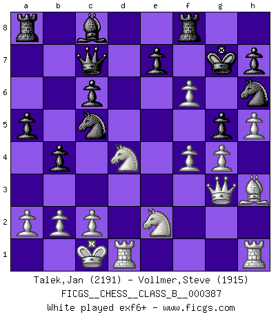 Last move : 1-0 2026 February 1 11:50:2 [Event "FICGS__CHESS__CLASS_B__000387"] [Site "FICGS"] [Date "2025.11.09"] [Round "1"] [White "Talek,Jan"] [Black "Vollmer,Steve"] [Result "1-0"] [WhiteElo "2191"] [BlackElo "1915"] 1.e4 d6 2.d4 Nf6 3.Nc3 g6 4.Be3 Bg7 5.Qd2 Nbd7 6.Nf3 c6 7.Bh6 O-O 8.e5 dxe5 9.Bxg7 Kxg7 10.dxe5 Ng8 11.O-O-O Qc7 12.Qf4 Nc5 13.g4 Ne6 14.Qg3 Nh6 15.h4 Nc5 16.Bh3 b5 17.Nd4 b4 18.Nce2 a5 19.h5 g5 20.f4 f6 21.exf6+ 1-0 Follow this game move after move (download)Some part of a mistake is always correct. (Savielly Tartakover) Jede Eröffnung ist gut genug um gespielt zu werden, wenn nur ihr Ruf schlecht genug ist. (Savielly Grigorievitsch Tartakower) Yo he agregado estos principios a la ley: pongan los Caballos en acción antes de que los dos Alfiles sean desarrollados. (Emanuel Lasker) Les Echecs sont affaire de jugement sensible. Savoir quand frapper et quand esquiver. (Fischer) Tree pose grows confidence. It roots me to this world. (Terri Guillemets)