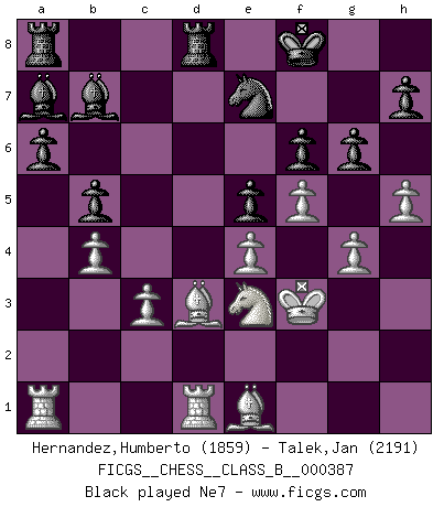 Last move : Ke8 2026 February 9 0:13:11 White clock - 82 days 12:02:40 (59 days 05:08:14) Black clock - 96 days 16:39:15 [Event "FICGS__CHESS__CLASS_B__000387"] [Site "FICGS"] [Date "2025.11.09"] [Round "1"] [White "Hernandez,Humberto"] [Black "Talek,Jan"] [Result "*"] [WhiteElo "1859"] [BlackElo "2191"] 1.e4 g6 2.d4 Bg7 3.Nc3 d5 4.Nxd5 c6 5.Nc3 Qxd4 6.Qxd4 Bxd4 7.Bd2 Bb6 8.Nf3 Bg4 9.Ne5 Be6 10.Na4 Bc7 11.Bc3 Nf6 12.Nc5 Bc8 13.f3 Rf8 14.Nc4 Nfd7 15.Nb3 Na6 16.a4 Nac5 17.Nxc5 Nxc5 18.b4 Ne6 19.Kf2 f6 20.g3 Kf7 21.Bd3 Rd8 22.Rhd1 Nd4 23.Ne3 e5 24.f4 a6 25.f5 b5 26.g4 Bb7 27.h4 Bb6 28.Be1 Kf8 29.h5 Ba7 30.axb5 cxb5 31.c3 Nc6 32.Kf3 Ne7 33.fxg6 hxg6 34.h6 g5 35.Bf2 Rac8 36.Be2 Bb6 37.Rxd8+ Rxd8 38.Nf5 Nxf5 39.Bxb6 Nh4+ 40.Ke3 Ng2+ 41.Kf2 Rd2 42.Rd1 Rxd1 43.Bxd1 Bxe4 44.Bb3 Nf4 45.Bc5+ Ke8 46.* Follow this game move after move (download)If your opponent cannot do anything active, then don't rush the position; instead you should let him sit there, suffer, and beg you for a draw. (Jeremy Silman) Ich bin der einzige Schachspieler, der sich während der Vorbereitungen zum Turnier verletzt hat. (Woody Allen) El Ajedrez es 99 por ciento táctica. (Teichmann) Karpov est une pièce de musée. (Garry Kasparov) Those who make the worst use of their time are the first to complain of its brevity. (Jean de la Bruyere)