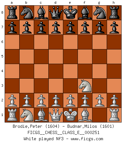 Last move : Kd5 2026 January 24 19:38:3 White clock - 78 days 02:58:16 (44 days 03:48:17) Black clock - 99 days 17:31:03 [Event "FICGS__CHESS__CLASS_E__000251"] [Site "FICGS"] [Date "2025.11.10"] [Round "1"] [White "Brodie,Peter"] [Black "Budnar,Milos"] [Result "*"] [WhiteElo "1604"] [BlackElo "1601"] 1.Nf3 h6 2.d4 d5 3.Bf4 Bg4 4.Nc3 e6 5.Nb5 Bd6 6.Bxd6 cxd6 7.Nc3 Nf6 8.h3 Bf5 9.e3 O-O 10.Be2 Ne4 11.Nxe4 Bxe4 12.O-O Qf6 13.Bd3 Bxd3 14.Qxd3 Nc6 15.Rae1 a6 16.a3 b5 17.b4 e5 18.dxe5 Qe6 19.Nd4 Nxd4 20.exd4 dxe5 21.Rxe5 Qc6 22.Rfe1 Qg6 23.Qxg6 fxg6 24.Rxd5 Rfd8 25.Rxd8+ Rxd8 26.c3 Rd6 27.Re8+ Kh7 28.Re3 h5 29.Re7 g5 30.Re5 Kh6 31.g4 h4 32.d5 Kg6 33.Re6+ Rxe6 34.dxe6 Kf6 35.Kg2 Kxe6 36.Kf3 Kd5 37.* Follow this game move after move (download)The game of Chess is not merely an idle amusement; several very valuable qualities of the mind are to be acquired and strengthened by it, so as to become habits ready on all occasions; for life is a kind of Chess. (Benjamin Franklin) Ich habe Kasparov in Rente geschickt. (Veselin Topalov) Vive, pierde y aprende al observar a tu oponente como gana. (Amber Steenbock) Psychologiquement, tu dois avoir confiance en toi même, mais cette confiance doit être basée sur des faits. (Robert Fischer) Over-the-board chess is the favorite of mortals, correspondence chess is the favorite of the gods. (Eduard Dyckhoff)
