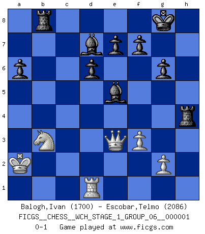 Last move : 0-1 2006 September 26 21:43:46 [Event "FICGS__CHESS__WCH_STAGE_1_GROUP_06__000001"] [Site "FICGS"] [Date "2006.07.01"] [Round "1"] [White "Balogh,Ivan"] [Black "Escobar,Telmo"] [Result "0-1"] [WhiteElo "1700"] [BlackElo "2086"] 1.d4 Nf6 2.c4 g6 3.Nc3 Bg7 4.e4 d6 5.f3 O-O 6.Be3 Nbd7 7.Qd2 c5 8.Nge2 a6 9.O-O-O Qa5 10.Kb1 b5 11.Nd5 Nxd5 12.Qxa5 Nxe3 13.Rd3 Nxc4 14.Qe1 Rb8 15.h4 cxd4 16.Nxd4 Nc5 17.Rd1 Na4 18.Bxc4 bxc4 19.b4 cxb3 20.axb3 Bd7 21.Qe3 Nc5 22.Ka2 Rb4 23.h5 Rfb8 24.hxg6 hxg6 25.e5 Bxe5 26.Rh4 Nxb3 27.Nxb3 Rxh4 0-1 King's Indian : Saemisch, 5...O-O Kingside Castling by player Black (move 5) Queenside Castling by player White (move 9) Player Black won this chess game. Follow this game move after move (download)The game of chess is the touchstone of the intellect. (Goethe) Die Elozahlen sind sehr schlecht für das Schach. Jetzt ist Schach eine Sportindustrie, die darauf zielt Elopunkte zu machen. (Miguel Najdorf) Yo creo que el Ajedrez posee una magia que es también una ayuda en la edad avanzada. Una rodilla reumática es olvidada durante una partida de Ajedrez y otros eventos pueden parecer algo sin importancia comparada a una catástrofe en el tablero de Ajedrez. (Vlastimil Hort) Les échecs sont utiles à l'exercice de la faculté de penser et à celle de l'imagination. Car nous devons posséder une méthode élaborée pour atteindre des buts partout où nous devons conduire notre raison. (Leibnitz) Nobody is always a winner, and anybody who says he is, is either a liar or doesn't play poker. (Amarillo Slim)
