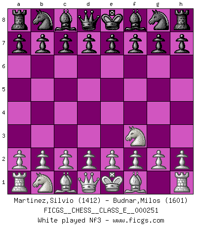 Last move : 1-0 2025 December 9 20:11:4 [Event "FICGS__CHESS__CLASS_E__000251"] [Site "FICGS"] [Date "2025.11.10"] [Round "1"] [White "Martinez,Silvio"] [Black "Budnar,Milos"] [Result "1-0"] [WhiteElo "1412"] [BlackElo "1601"] 1.Nf3 h6 2.e4 d5 3.d4 dxe4 4.Nfd2 Nf6 5.Nc3 e6 6.Ndxe4 Nxe4 7.Nxe4 Bd6 8.Bc4 O-O 9.O-O a6 10.c3 b5 11.Qf3 Nc6 12.Re1 Qh4 13.h3 Qe7 14.Qg4 f5 15.Qf3 fxe4 16.Qxe4 Qd7 17.d5 Ne5 18.dxe6 1-0 Follow this game move after move (download)I like the moment when I break a man's ego. (Bobby Fischer) Das Schachspiel hat wie die Liebe, die Musik, die Fähigkeit, den Menschen glücklich zu machen. Ich habe ein leises Gefühl des Bedauerns für jeden, der das Schachspiel nicht kennt, so wie ich jeden bedaure, der die Liebe nicht kennt. (Siegbert Tarrasch) El Ajedrez es una manera fabulosa para que los niños aprendan a autovalorarse y a autoestimarse. (Saudin Robovic) L'attaque fait le spectacle, la défense gagne les matchs. (Dicton footballistique) Men never do evil so completely and cheerfully as when they do it from religious conviction. (Blaise Pascal)