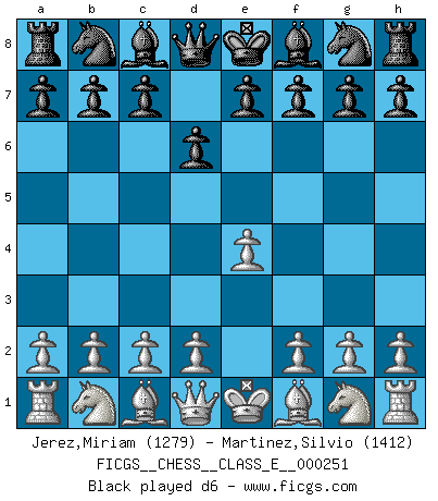 Last move : R7f4 2026 February 8 23:48:24 White clock - 89 days 12:29:47 (59 days 11:09:02) Black clock - 99 days 23:49:02 [Event "FICGS__CHESS__CLASS_E__000251"] [Site "FICGS"] [Date "2025.11.10"] [Round "1"] [White "Jerez,Miriam"] [Black "Martinez,Silvio"] [Result "*"] [WhiteElo "1279"] [BlackElo "1412"] 1.e4 d6 2.Nf3 Nf6 3.Ng5 Be6 4.d4 h6 5.Nxe6 fxe6 6.Nc3 Nc6 7.Bd3 Nxd4 8.O-O d5 9.Re1 e5 10.exd5 e6 11.dxe6 Nxe6 12.Bg6+ Ke7 13.Qxd8+ Rxd8 14.b3 Nf4 15.Bxf4 Ng4 16.h3 Kf6 17.Bh5 Nxf2 18.Bxe5+ Kg5 19.Bf3 Bc5 20.Bxc7 Rc8 21.a4 Nd3 22.Kf1 Rxc7 23.cxd3 Rf8 24.Ke2 Re7+ 25.Be4 Rf2+ 26.Kd1 Bb4 27.Rc1 b6 28.Na2 Bxe1 29.Kxe1 Ref7 30.Rc4 h5 31.h4+ Kxh4 32.Bg6 R7f4 33.* Follow this game move after move (download)The passion for playing Chess is one of the most unaccountable in the world. (H.G. Wells) Kostenjuk hat keinen Sexappeal. (Loek van Wely) Hasta este punto, las blancas han seguido un análisis bien conocido. Pero ahora el hace un error fatal: empieza a usar su propia cabeza. (Siegbert Tarrasch) Le thème de l'attaque double intervient d'une manière ou d'une autre dans l'immense majorité des combinaisons. (Youri Averbakh) Creativity is inventing, experimenting, growing, taking risks, breaking rules, making mistakes, and having fun. (Mary Lou Cook)