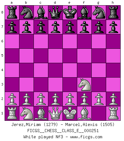 Last move : 0-1 2026 February 6 23:54:46 [Event "FICGS__CHESS__CLASS_E__000251"] [Site "FICGS"] [Date "2025.11.10"] [Round "1"] [White "Jerez,Miriam"] [Black "Marcel,Alexis"] [Result "0-1"] [WhiteElo "1279"] [BlackElo "1505"] 1.Nf3 f5 2.d4 Nf6 3.Nc3 g6 4.e3 Bg7 5.Bc4 d6 6.Ng5 d5 7.Nxd5 Nxd5 8.O-O O-O 9.e4 fxe4 10.Re1 c6 11.Rxe4 Kh8 12.Re6 h6 13.Rxg6 hxg5 14.Qh5+ Kg8 15.Qxg5 Rf7 16.h4 Qf8 17.h5 Rf5 18.Qh6 Nd7 19.Bxd5+ Rxd5 20.Be3 Nf6 21.c4 Rxh5 22.Qf4 Qf7 23.Rg5 Rxg5 24.Qxg5 Qh5 25.Re1 Qxg5 26.Bxg5 Kf7 27.f4 Be6 28.Kf2 Bxc4 29.b3 Bd5 30.Rh1 Ne4+ 31.Kg1 Bxd4+ 32.Kh2 Rh8+ 0-1 Follow this game move after move (download)You must take your opponent into a deep dark forest where 2+2=5, and the path leading out is only wide enough for one. (Mikhail Tal) Auf Remis zu spielen ist gewissermaßen ein Verbrechen gegen das Schachspiel. (Mikhail Nekhemyevich Tal) Muchos se han convertido en Maestros de Ajedrez, nadie se ha convertido en el Maestro del Ajedrez. (Siegbert Tarrasch) Le pion, dans sa simplicité, marche droit devant lui, mais lorsqu'il prend, il le fait obliquement? Ainsi l'homme, tant qu'il reste pauvre, marche dans la droiture et vit honnêtement, mais lorsqu'il recherche les honneurs, il flatte, se parjure et, par les voies obliques, cherche une position supérieure sur l'échiquier du monde. (Jean de Galles) To send light into the darkness of men's hearts - such is the duty of the artist. (Schumann)