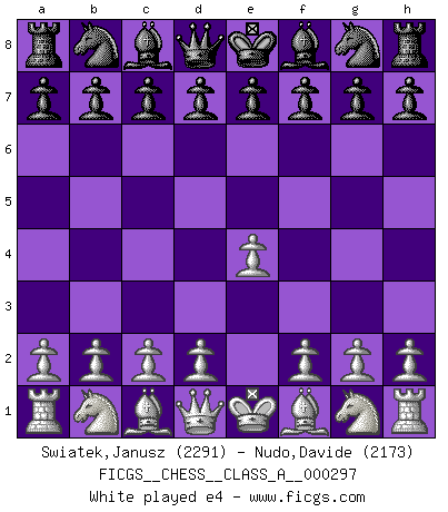 Last move : 1/2-1/2 2026 January 18 11:56:28 [Event "FICGS__CHESS__CLASS_A__000297"] [Site "FICGS"] [Date "2025.11.11"] [Round "1"] [White "Swiatek,Janusz"] [Black "Nudo,Davide"] [Result "1/2-1/2"] [WhiteElo "2291"] [BlackElo "2173"] 1.e4 e5 2.Nf3 Nf6 3.Nxe5 d6 4.Nf3 Nxe4 5.d4 d5 6.Bd3 Be7 7.O-O Nc6 8.c4 Nb4 9.Be2 O-O 10.a3 Nc6 11.cxd5 Qxd5 12.Re1 Bd6 13.Be3 Bf5 14.Nh4 Bd7 15.Bf3 Rae8 16.Qd3 f5 17.Nc3 Qb3 18.Bh5 Re6 19.Be2 R6e8 20.Bd1 Qf7 21.Nf3 a6 22.Bc2 Qh5 23.h3 Kh8 24.Rad1 Re6 25.Nd5 1/2-1/2 Follow this game move after move (download)Any material change in a position must come about by mate, a capture, or a Pawn promotion. (Purdy) Ich verstehe mehr vom Schach als irgendein anderer lebender Meister. (José Raúl Capablanca) ¿Esta Bobby Fischer algo cuerdo?. (Salo Flohr) Il vaut toujours mieux jouer un plan faux de façon logique que de n'avoir pas de plan du tout. (Victor Kortchnoï) All maxims have their antagonist maxims; proverbs should be sold in pairs, a single one being but a half truth. (William Mathews)