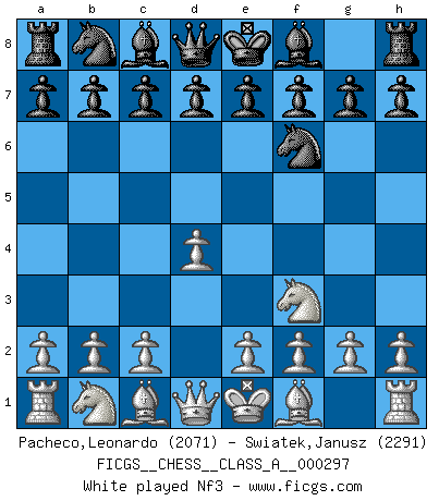 Last move : 0-1 2026 January 1 22:33:25 [Event "FICGS__CHESS__CLASS_A__000297"] [Site "FICGS"] [Date "2025.11.11"] [Round "1"] [White "Pacheco,Leonardo"] [Black "Swiatek,Janusz"] [Result "0-1"] [WhiteElo "2071"] [BlackElo "2291"] 1.d4 Nf6 2.Nf3 e6 3.g4 d5 4.g5 Ne4 5.c3 Be7 6.h4 O-O 7.Nbd2 f5 8.gxf6 Nxf6 9.e4 dxe4 0-1 This chess game has been lost on time (started : 2025.11.11 0:33:5) Follow this game move after move (download)Man is a frivolous, a specious creature, and like a Chess player, cares more for the process of attaining his goal than for the goal itself. (Dostoyevsky) Ich trinke, ich rauche, ich spiele, ich liebe Frauen aber Fernschach ist ein Laster, das ich nicht habe. (Mikhail Nekhemyevich Tal) Si un gobernante no entiende al Ajedrez, ¿como puede governar él un reinado?. (El Rey Khusros II) En blitz, le Cavalier l'emporte sur le Fou. (Vlastimil Hort) Do not put your faith in what statistics say until you have carefully considered what they do not say. (William W. Watt)
