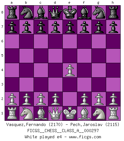Last move : h4 2026 January 4 1:34:27 White clock - 65 days 21:33:32 Black clock - 10 days 12:29:49 [Event "FICGS__CHESS__CLASS_A__000297"] [Site "FICGS"] [Date "2025.11.11"] [Round "1"] [White "Vasquez,Fernando"] [Black "Pech,Jaroslav"] [Result "*"] [WhiteElo "2170"] [BlackElo "2115"] 1.e4 e6 2.d4 d5 3.e5 c5 4.c3 Nc6 5.Nf3 Qb6 6.a3 c4 7.Nbd2 Na5 8.Be2 Bd7 9.O-O Ne7 10.Rb1 Qc7 11.h4 * Follow this game move after move (download)Chess is like war on a board. (Bobby Fischer) Es gibt nur zwei wahre Schachgenies - das andere war Wilhelm Steinitz, der Weltmeister von 1872 bis 1894. (Robert James Fischer) El Ajedrez es el gimnasio de la mente. (Blaise Pascal) Horreur, mais aussi harmonie suprême : qu'y avait-il en effet au monde en dehors des échecs ? Le brouillard, l'inconnu, le non-être... (Vladimir Nabokov) Perception is reality. (Immanuel Kant)