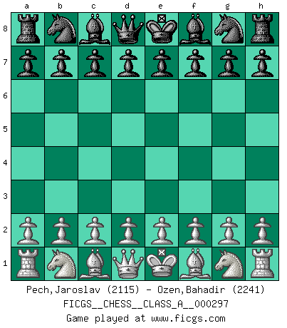 Last move : Qc7 2026 January 1 13:53:6 White clock - 5 days 09:13:08 Black clock - 73 days 21:44:56 [Event "FICGS__CHESS__CLASS_A__000297"] [Site "FICGS"] [Date "2025.11.11"] [Round "1"] [White "Pech,Jaroslav"] [Black "Ozen,Bahadir"] [Result "*"] [WhiteElo "2115"] [BlackElo "2241"] 1.d4 Nf6 2.c4 e6 3.g3 Bb4+ 4.Bd2 Be7 5.Bg2 d5 6.Nf3 O-O 7.O-O c6 8.Qc2 b6 9.Rd1 Nbd7 10.b3 h6 11.Bc3 Bb7 12.Nbd2 Qc7 13.* Follow this game move after move (download)Strategy requires thought, tactics require observation. (Max Euwe) Schach ist gnadenlos. Du mußt bereit sein zu töten. (Nigel Short) El Ajedrez es en su esencia, un juego. En su forma, un arte. Y en su ejecución, una ciencia. (Baron Tassilo) Tout change constamment, y compris dans le monde des Echecs. (Botvinnik) If everyone is thinking alike, then somebody isn't thinking. (US General George S. Patton)