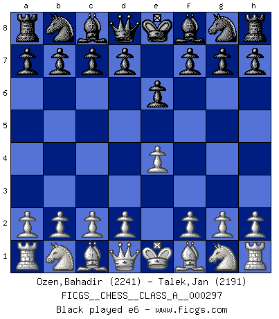 Last move : 1/2-1/2 2025 December 11 23:45:37 [Event "FICGS__CHESS__CLASS_A__000297"] [Site "FICGS"] [Date "2025.11.11"] [Round "1"] [White "Ozen,Bahadir"] [Black "Talek,Jan"] [Result "1/2-1/2"] [WhiteElo "2241"] [BlackElo "2191"] 1.e4 e6 2.d4 d5 3.Nd2 c5 4.Ngf3 cxd4 5.exd5 Qxd5 6.Bc4 Qd6 7.O-O Nf6 8.Nb3 Nc6 9.Nbxd4 Nxd4 10.Nxd4 Be7 11.Re1 O-O 12.c3 Bd7 13.Qf3 Rac8 14.Bf4 Qb6 15.Bb3 a5 16.a4 Bc6 17.Qe2 Bd5 18.Bxd5 Nxd5 19.Bg3 Rfd8 20.Rad1 1/2-1/2 Follow this game move after move (download)After a bad opening, there is hope for the middle game. After a bad middle game, there is hope for the endgame. But once you are in the endgame, the moment of truth has arrived. (Edmar Mednis) Bogoljubow: Matt in vier Zügen! Tartakower: Ich verbitte mir jede Belästigung! (Savielly Grigorievitsch Tartakower) El Ajedrez es tortura mental. (Garry Kasparov) On peut tirer plus d'utilité d'une partie perdue que de 100 parties gagnées. (Capablanca) Those parts of the system that you can hit with a hammer (not advised) are called hardware; those program instructions that you can only curse at are called software. (Anonymous)