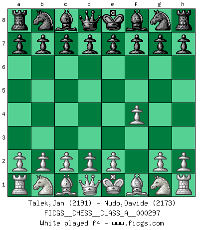 Last move : 1/2-1/2 2026 January 23 11:49:34 [Event "FICGS__CHESS__CLASS_A__000297"] [Site "FICGS"] [Date "2025.11.11"] [Round "1"] [White "Talek,Jan"] [Black "Nudo,Davide"] [Result "1/2-1/2"] [WhiteElo "2191"] [BlackElo "2173"] 1.f4 Nf6 2.c4 e6 3.Nf3 d5 4.e3 c5 5.b3 Be7 6.Be2 b6 7.O-O O-O 8.Nc3 Bb7 9.Ne5 Nc6 10.d3 Ne8 11.Bf3 Nxe5 12.fxe5 f6 13.d4 cxd4 14.exd4 fxe5 15.dxe5 Qc7 16.Be3 Qxe5 17.Bd4 Qd6 18.Nb5 Qd7 19.Qe2 Nd6 20.Nxd6 Bxd6 21.Bg4 Rae8 22.Rxf8+ Bxf8 23.Re1 Bc8 24.Kh1 Bb4 25.Rf1 dxc4 26.Qxc4 Bd6 27.Rd1 Qe7 28.Bg1 Bb8 29.Bf3 Kh8 30.a4 e5 31.b4 Bd6 32.a5 Bxb4 33.axb6 axb6 34.Bxb6 Be6 35.Qd3 Bf7 36.Be4 Qe6 37.Bg1 Be7 38.Bf5 1/2-1/2 Follow this game move after move (download)If one piece is badly posted, the whole game is bad. (Tarrasch) Je mehr wir mit Computern analysieren, desto mehr glauben wir an Verteidigung. (Vladimir Kramnik) Los problemas de Ajedrez exigen del compositor las mismas virtudes que caracterizan todo el arte de valor: originalidad, invención, concisión, armonía, complejidad e insinceridad explendida. (Vladimir Nabokov) Les Echecs sont et restent toujours un combat, un combat intégral comme la boxe, la lutte ou un autre sport, et où il doit y avoir un vainqueur et un vaincu. (Joseph Emil Diemer) My poor ole parrot... Is not in the circulation of displays ....poo hoo hoo :) (Wayne Lowrance's enigma)