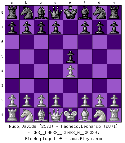 Last move : 1-0 2026 January 27 3:30:39 [Event "FICGS__CHESS__CLASS_A__000297"] [Site "FICGS"] [Date "2025.11.11"] [Round "1"] [White "Nudo,Davide"] [Black "Pacheco,Leonardo"] [Result "1-0"] [WhiteElo "2173"] [BlackElo "2071"] 1.e4 e5 2.Nf3 f6 3.Nxe5 Qe7 4.Nf3 d5 5.d3 dxe4 6.dxe4 Qxe4+ 7.Be2 Nc6 8.O-O Bd7 9.Nc3 Qe6 10.Bf4 O-O-O 11.Nb5 Bc5 12.Bxc7 1-0 Follow this game move after move (download)With or without the title, Bobby Fischer was unquestionably the greatest player of his time. (Burt Hochberg) Schach ist eine Sache der genauen Beurteilung, wann man zuschlagen und wann man sich ducken muss. (Robert James Fischer) Robert Fischer es la ley hacia si mismo. (Larry Evans) La tactique, c'est ce que vous faites quand il y a quelque chose à faire; la stratégie, c'est ce que vous faites quand il n'y a rien à faire. (Savielli Tartacower) The smarter you play, the luckier you'll be. (Mark Pilarski)