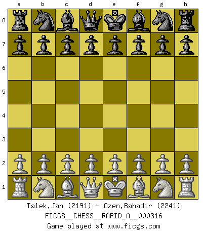 Last move : 0-1 2026 January 15 1:30:19 [Event "FICGS__CHESS__RAPID_A__000316"] [Site "FICGS"] [Date "2025.11.11"] [Round "1"] [White "Talek,Jan"] [Black "Ozen,Bahadir"] [Result "0-1"] [WhiteElo "2191"] [BlackElo "2241"] 1.g4 d5 2.c4 Bxg4 3.Qb3 dxc4 4.Qxb7 Nd7 5.Na3 e5 6.Nxc4 Be6 7.Ne3 Rb8 8.Qxa7 f5 9.Qa4 f4 10.Nd1 Ngf6 11.Nf3 Bd6 12.Qc2 O-O 13.d3 Bf5 14.Nc3 Nc5 15.Bg2 Kh8 16.Nh4 Bg4 17.h3 Bh5 18.Bd2 Ne6 19.Nf3 Nd4 20.Qd1 Qe7 21.b3 Rbd8 22.Kf1 Bxf3 23.Bxf3 Ba3 24.Bg2 Qf7 25.h4 f3 26.exf3 Qg6 27.Qb1 Bb4 28.a3 Bxc3 29.Bxc3 Nd5 30.Bxd4 Nf4 31.Rh2 Rxd4 32.Kg1 Nxd3 33.Qc2 Rxf3 34.h5 Qg5 35.Qc6 Rf8 36.h6 Nxf2 37.hxg7+ Qxg7 38.Qh6 Qe7 39.Qc1 Rd1+ 0-1 George Jempty please somebody play 1.g4? against me in a rated game Ilmars Cirulis Hehe, brave choice by white. The most brave first move possible. :) Follow this game move after move (download)All that matters on the Chessboard is good moves. (Bobby Fischer) Im Blitz ist es einfacher mit einer Figur weniger anzugreifen, als sich mit einer Mehrfigur zu verteidigen. (Mikhail Nekhemyevich Tal) Aquel que ve no otra dirección en el juego que la de dar Jaque Mate a su oponente, nunca será un buen jugador de Ajedrez. (Euwe) Il n'y a pas eu de défaite parce que je ne crois pas que cet ordinateur ait jamais existé. IBM a triché en refusant d'imprimer les modes de recherche de la machine. C'est évident, pendant le match, des coups décisifs ont été joués par des êtres humains. Aujourd'hui, les meilleurs spécialistes en informatique ne peuvent toujours pas expliquer comment Deep-Blue a pu jouer contre la logique des ordinateurs. IBM a gagné une guerre de communication, mais ils sont incapables de prouver que l'ordinateur a gagné tout seul. (Garry Kasparov) It is the aim of the modern school, not to treat every position according to one general law, but according to the principle inherent in the position. (Richard Reti)