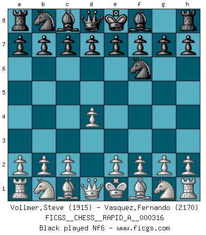 Last move : Rfe8 2026 January 13 12:30:42 White clock - 7 days 22:01:12 Black clock - 15 days 23:18:18 [Event "FICGS__CHESS__RAPID_A__000316"] [Site "FICGS"] [Date "2025.11.11"] [Round "1"] [White "Vollmer,Steve"] [Black "Vasquez,Fernando"] [Result "*"] [WhiteElo "1915"] [BlackElo "2170"] 1.d4 Nf6 2.c4 b6 3.Nc3 Bb7 4.Nf3 e6 5.Bg5 h6 6.Bh4 Bb4 7.e3 g5 8.Bg3 Ne4 9.Rc1 h5 10.h4 g4 11.Ne5 Bxc3+ 12.bxc3 d6 13.Nd3 Nd7 14.Nf4 e5 15.Nd3 Qf6 16.Rg1 Qh6 17.Qe2 O-O-O 18.Nb4 f5 19.Nd3 Rhf8 20.dxe5 dxe5 21.Rc2 Rfe8 22.* Follow this game move after move (download)The winner of the game is the player who makes the next-to-last mistake. (Savielly Tartakover) Wie gewinnt Tal? Er entwickelt alle seine Figuren in die Brettmitte und opfert sie dann irgendwo. (Robert James Fischer) Siempre es mejor sacrificar los hombres de tu oponente. (Savielly Tartakower) Le thème de l'attaque double intervient d'une manière ou d'une autre dans l'immense majorité des combinaisons. (Youri Averbakh) When it is a question of money, everybody is of the same religion. (Voltaire)
