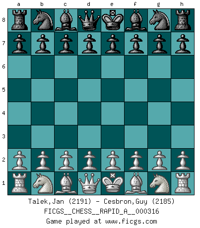 Last move : 1/2-1/2 2025 December 27 2:27:34 [Event "FICGS__CHESS__RAPID_A__000316"] [Site "FICGS"] [Date "2025.11.11"] [Round "1"] [White "Talek,Jan"] [Black "Cesbron,Guy"] [Result "1/2-1/2"] [WhiteElo "2191"] [BlackElo "2185"] 1.h4 d5 2.d4 c5 3.e3 Nc6 4.c4 cxd4 5.exd4 Nf6 6.Nc3 dxc4 7.Nf3 Be6 8.Be2 g6 9.h5 gxh5 10.Qa4 Bg7 11.Bxc4 Bd7 12.d5 Ne5 13.Bb5 Nxf3+ 14.gxf3 a6 15.Bxd7+ Qxd7 16.Qxd7+ Kxd7 17.Be3 Rac8 18.Ke2 Rhd8 19.Bb6 Rg8 20.Rh4 Bf8 21.a4 Rg6 22.Rd1 Ke8 23.a5 Bg7 24.Be3 1/2-1/2 Follow this game move after move (download)Chess is thirty to forty percent psychology. You don't have this when you play a computer. I can't confuse it. (Judith Polgar) Das Schachspiel ist ein See, in welchem eine Mücke baden und ein Elefant ertrinken kann. (Emanuel Lasker) El ganar no lo es todo... pero el perder es nada. (Mednis) Les échecs sont un jeu par leur forme, un art par leur essence et une science par sa difficulté d'acquisition. Ils peuvent vous procurer autant de plaisir qu'un bon livre ou une belle musique, mais vous n'aurez une réelle joie que si vous arrivez à bien jouer. (Tigran Petrosian) When you have everything, sometimes it feels like nothing. (Horatio Caine, C.S.I. Miami)