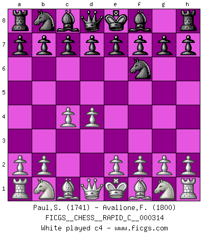 Last move : 0-1 2026 January 20 15:31:47 [Event "FICGS__CHESS__RAPID_C__000314"] [Site "FICGS"] [Date "2025.11.15"] [Round "1"] [White "Paul,Samagata"] [Black "Avallone,Francesca"] [Result "0-1"] [WhiteElo "1741"] [BlackElo "1800"] 1.d4 Nf6 2.c4 c5 3.Bf4 cxd4 4.Qxd4 Nc6 5.Qd1 e5 6.Bg5 Bb4+ 7.Nc3 Qa5 8.Qc2 Ne4 9.Bd2 Nxc3 10.bxc3 Be7 11.e3 d5 12.cxd5 Qxd5 13.Nf3 O-O 14.Be2 b6 15.O-O Rd8 16.Rfd1 Qc5 17.Qb2 Be6 18.a3 Na5 19.h3 Bc4 20.Bxc4 Nxc4 21.Qb4 Qc7 22.Qb3 Rd7 23.Ra2 Rad8 24.Qb5 Rd5 25.Qb3 h6 26.a4 Na5 27.Qc2 Qd6 28.c4 Qc5 29.Rc1 Rd3 30.Bxa5 Qxa5 31.Qb2 Rd1+ 32.Rxd1 Rxd1+ 33.Kh2 Qc5 34.Qc2 Rd8 35.Qe4 Bf6 36.Nd2 Qb4 37.Qb7 Rxd2 38.Rxd2 Qxd2 39.Qxa7 Qxf2 40.Qxb6 Bh4 41.Qb8+ Kh7 42.Qxe5 Bg5 43.Qg3 Qd2 44.h4 Bxe3 45.Kh3 h5 46.Qf3 Bf4 47.Qxh5+ Kg8 48.Qf3 Qd4 49.g3 Bc7 50.Qc6 Qe5 51.Qa8+ Kh7 52.Qf3 Qe6+ 53.Qg4 f5 54.Qh5+ Kg8 55.Kg2 Qc6+ 56.Qf3 Qxc4 57.Qxf5 Qc6+ 58.Kh2 Qd6 59.Qf3 Qd4 60.Qb3+ Kh8 61.Kh3 Qd7+ 62.g4 Qd6 63.g5 Qh2+ 64.Kg4 Qg2+ 65.Kh5 Qe4 66.Qb5 Bg3 67.a5 Kh7 0-1 Follow this game move after move (download)No price is too great for the scalp of the enemy King. (Koblentz) Zum Sieg gelangt man nicht, wenn man gut, sondern nur wenn man besser spielt (Savielly Grigorievitsch Tartakower) En partidas rápidas, el Caballo es mas poderoso que el Alfil. (Vlastimil Hort) La vérité est comme le meilleur coup aux échecs : elle existe, mais il faut la chercher. (Arturo Perez-Reverte) The weakness of an artist is dogma. (Josh Waitzkin)