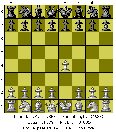 Last move : 1-0 2026 January 11 15:25:50 [Event "FICGS__CHESS__RAPID_C__000314"] [Site "FICGS"] [Date "2025.11.15"] [Round "1"] [White "Leurette,Marc-Antoine"] [Black "Nurcahyo,Dery"] [Result "1-0"] [WhiteElo "1785"] [BlackElo "1689"] 1.e4 e5 2.Nf3 d6 3.d4 Nd7 4.Nc3 f6 5.Bc4 Nb6 6.Bb3 Ne7 7.dxe5 Ng6 8.exf6 gxf6 9.Be3 Bd7 10.Qe2 c6 11.O-O-O Qc7 12.Nd4 Qc8 13.f4 Bg7 14.f5 Ne7 15.Bf4 Qc7 16.g4 O-O-O 17.Ne6 Bxe6 18.Bxe6+ Kb8 19.h4 Ka8 20.g5 fxg5 21.hxg5 Be5 22.Bxe5 dxe5 23.Rxd8+ Qxd8 24.Qh5 Qd4 25.g6 h6 26.g7 Qe3+ 27.Kb1 Rd8 28.f6 1-0 Follow this game move after move (download)Fischer is under obligation to nobody. (Joseph Platz) Ein Kibitz ist einer, der deinem Gegner gute Ratschläge gibt. (Andrew Soltis) Aquellos que dicen entender al Ajedrez, no entienden nada. (Robert Hubner) Mon pion favori sur ma case favorite ! Bronstein en parlant d'un coup de pion en h5 quand il avait les Noirs. I find your interest interesting. (Gregory House, House M.D.)