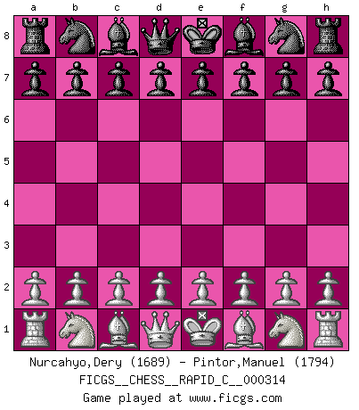 Last move : d4 2026 February 14 11:8:39 White clock - 6 days 21:58:35 Black clock - 50 days 23:28:56 [Event "FICGS__CHESS__RAPID_C__000314"] [Site "FICGS"] [Date "2025.11.15"] [Round "1"] [White "Nurcahyo,Dery"] [Black "Pintor,Manuel"] [Result "*"] [WhiteElo "1689"] [BlackElo "1794"] 1.e4 e5 2.Nc3 Bc5 3.Nf3 Nc6 4.a3 a5 5.d3 h6 6.Na4 Ba7 7.Be2 b5 8.Nc3 b4 9.Nd5 Nf6 10.Ne3 d6 11.O-O O-O 12.h3 Nd4 13.Nxd4 Bxd4 14.axb4 a4 15.c3 Bxe3 16.Bxe3 Bd7 17.Kh1 Nh7 18.c4 Qb8 19.b5 c6 20.Rxa4 Rxa4 21.Qxa4 cxb5 22.Qc2 Nf6 23.b3 bxc4 24.bxc4 Nh7 25.Rb1 Qc7 26.Qb2 Ng5 27.Bxg5 hxg5 28.Kh2 f5 29.f3 f4 30.Ra1 Rb8 31.Qa2 Kf8 32.Bf1 Qc5 33.Qc2 Qd4 34.Ra2 Ke7 35.Qc1 Rb4 36.Ra6 Rb2 37.Qe1 Qe3 38.Qd1 Rd2 39.Qa1 Qc5 40.Qc1 Qe3 41.Kh1 Bxh3 42.c5 dxc5 43.Ra7+ Bd7 44.Qc4 Rd1 45.d4 * Follow this game move after move (download)A good sacrifice is one that is not necessarily sound but leaves your opponent dazed and confused. (Rudolph Spielmann) Ihnen, Herr Lasker, habe ich nur drei Worte zu sagen: Schach und matt. (Siegbert Tarrasch) Un mal día en el Ajedrez, es mejor que cualquier buen día en el trabajo. (Anonymous) L'attaque fait le spectacle, la défense gagne les matchs. (Dicton footballistique) Luck never gives; it only lends. (Swedish proverb)