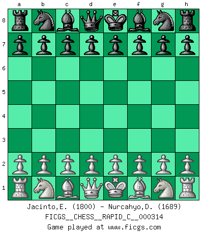 Last move : Rxd7 2026 February 12 11:46:24 White clock - 8 days 07:26:34 Black clock - 18 days 12:35:23 [Event "FICGS__CHESS__RAPID_C__000314"] [Site "FICGS"] [Date "2025.11.15"] [Round "1"] [White "Jacinto,Estefanie Grace"] [Black "Nurcahyo,Dery"] [Result "*"] [WhiteElo "1800"] [BlackElo "1689"] 1.e4 e5 2.Nf3 Nc6 3.Bb5 Nd4 4.Nxd4 exd4 5.O-O c6 6.Bc4 Nf6 7.d3 Bd6 8.e5 Bxe5 9.Qe2 d5 10.Qxe5+ Be6 11.Bb3 O-O 12.Bg5 h6 13.Bxf6 Qxf6 14.Qxf6 gxf6 15.c3 dxc3 16.Nxc3 Kh8 17.d4 Rg8 18.Rfe1 Bh3 19.g3 Rae8 20.Ne2 Re4 21.Bc2 Re7 22.Nf4 Be6 23.Re2 Rge8 24.Rae1 Kg8 25.Nh5 Rd8 26.f4 R7e8 27.f5 Bd7 28.Nxf6+ Kf8 29.Nxd7+ Rxd7 30.* Follow this game move after move (download)If Chess is a science, it's a most inexact one. If Chess is an art, it is too exacting to be seen as one. If Chess is a sport, it's too esoteric. If Chess is a game, it's too demanding to be just a game. If Chess is a mistress, she's a demanding one. If Chess is a passion, it's a rewarding one. If Chess is life, it's a sad one. (Unknown) Wenn Capablanka heute auf der Schachbühne erscheinen würde, hätte er ein halbes Jahr gebraucht um sich die Schachtheorie anzueignen. Und dann hätte er alles und jeden besiegt. (Mikhail Moiseyevich Botvinik) Cuando estes solo, cuando te sientas un extraño en el mundo, juega al Ajedrez. Esto levantará tu espiritu y será tu consejero de guerra. (Aristóteles) Avant la finale, les dieux ont créé le milieu de partie. (Tarrasch) Luck never made a man wise. (Seneca, Letters to Lucilius)