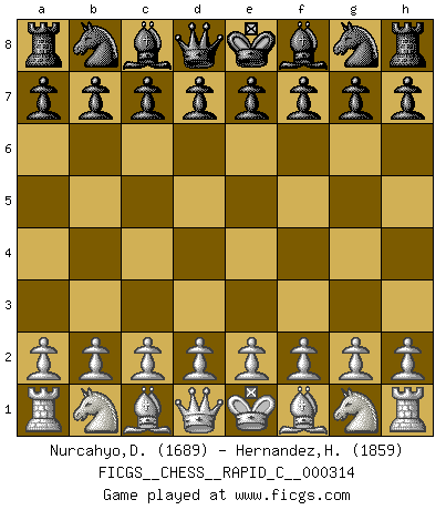 Last move : Rxb2 2026 February 12 11:46:33 White clock - 7 days 06:27:17 Black clock - 6 days 11:57:30 [Event "FICGS__CHESS__RAPID_C__000314"] [Site "FICGS"] [Date "2025.11.15"] [Round "1"] [White "Nurcahyo,Dery"] [Black "Hernandez,Humberto"] [Result "*"] [WhiteElo "1689"] [BlackElo "1859"] 1.d4 Nf6 2.Nc3 g6 3.e4 d6 4.Bc4 Bg7 5.Nge2 O-O 6.Be3 c6 7.O-O b5 8.Bd3 e5 9.h3 exd4 10.Nxd4 b4 11.Nce2 Bb7 12.Qd2 c5 13.Nf3 Nxe4 14.Qc1 Nd7 15.Bxe4 Bxe4 16.Nd2 Bc6 17.Nc4 d5 18.Nd2 d4 19.Bf4 Re8 20.Qd1 Nb6 21.Bh2 Na4 22.Rb1 Nxb2 23.Rxb2 * Follow this game move after move (download)Human affairs are like a Chess game: only those who do not take it seriously can be called good players. (Hung Tzu Ch'eng) Intelligenz läßt sich nicht am Weg, sondern nur am Ergebnis feststellen. (Garry Kasparov) ¡Examina movidas que hagan daño! Un buen ojo for movidas desvastantes es mucho mas importante que el conocimiento de principios estratégicos. (Purdy) Les pièces de l'échiquier étaient impitoyables. Elles le retenaient, elles l'absorbaient. Il y avait de l'horreur en cela, mais aussi une harmonie unique. Car, qu'y a-t-il dans le monde, à part les échecs ? (V. Nabokov) Kids, you tried your best and you failed miserably. The lesson is, never try. (Simpsons)