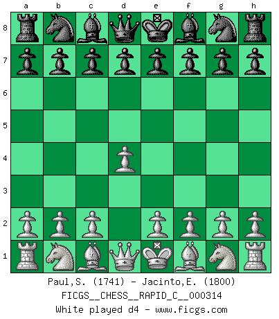 Last move : 0-1 2025 December 30 5:55:22 [Event "FICGS__CHESS__RAPID_C__000314"] [Site "FICGS"] [Date "2025.11.15"] [Round "1"] [White "Paul,Samagata"] [Black "Jacinto,Estefanie Grace"] [Result "0-1"] [WhiteElo "1741"] [BlackElo "1800"] 1.d4 d5 2.c4 dxc4 3.Nc3 Nf6 4.e4 e5 5.d5 b5 6.a3 a6 7.h3 Bd6 8.Nf3 Nbd7 9.Qc2 Nc5 10.Be3 Nb3 11.Rd1 O-O 12.Be2 Rb8 13.O-O Qe7 14.Nd2 Nd4 15.Qb1 b4 16.axb4 Bxb4 17.Bxd4 exd4 18.Na2 Bxd2 19.Rxd2 c3 20.Rc2 Qxe4 21.Bf3 Qg6 22.Kh2 Bf5 23.Rfc1 Bxc2 24.Rxc2 cxb2 25.h4 Rfe8 26.h5 Qf5 27.Nc1 Qf4+ 28.Kg1 Re1+ 0-1 Follow this game move after move (download)Any material change in a position must come about by mate, a capture, or a Pawn promotion. (Purdy) Alle offensichtlichen Züge sehen nach dem Spiel in der Analyse verdächtig aus. (Viktor Kortschnoi) Los libros de Ajedrez deben de usarse igual como usamos los anteojos: para mejorar la vista, aunque algunos jugadores los quieren usar como si ellos les otorgaran la vision. (José Raúl Capablanca) D'abord les bases : Jouez et étudiez, puis étudiez et jouez, ensuite jouez et étudiez, puis étudiez et jouez. Deuxièmement : Donnez toujours le meilleur de vous-même ! (Ken Smith) They misunderestimated me. (George W. Bush, Bentonville nov. 6, 2000)