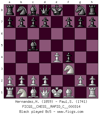 Last move : 1-0 2025 November 19 10:26:59 [Event "FICGS__CHESS__RAPID_C__000314"] [Site "FICGS"] [Date "2025.11.15"] [Round "1"] [White "Hernandez,Humberto"] [Black "Paul,Samagata"] [Result "1-0"] [WhiteElo "1859"] [BlackElo "1741"] 1.e4 e5 2.f4 exf4 3.Nf3 Bc5 4.d4 Bb6 5.Bxf4 d6 6.Qd2 h6 7.Nc3 Nf6 8.O-O-O Nc6 9.Bc4 Na5 10.Bd3 Bg4 11.Rde1 O-O 12.Bxh6 gxh6 13.Qxh6 Nh7 14.e5 f5 15.exf6 Rf7 16.Ng5 Qxf6 17.Bxh7+ 1-0 Follow this game move after move (download)A bad plan is better than none at all. (Frank Marshall) Schach ist wie eine schöne Frau, zu der wir ständig zurückkehren, gleichviel, wie oft sie uns zurückweist. (Anonymous) Dios mío, Bobby Fischer juega tan simple. (Alexei Suetin) C'est la seule position que je connaisse où les deux camps sont mals. Propos prêtés à V. Anand. Pushing plastic is for the many, pushing virtual pieces is for the fewer, pushing wood is for the very few. (Normajean Yates)