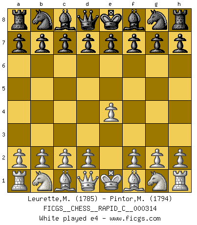 Last move : 1-0 2025 December 9 1:30:56 [Event "FICGS__CHESS__RAPID_C__000314"] [Site "FICGS"] [Date "2025.11.15"] [Round "1"] [White "Leurette,Marc-Antoine"] [Black "Pintor,Manuel"] [Result "1-0"] [WhiteElo "1785"] [BlackElo "1794"] 1.e4 e5 2.Nf3 Nc6 3.d4 exd4 4.Nxd4 Qf6 5.Nc3 Qxd4 6.Bd3 Ne5 7.Nd5 Qc5 8.Be3 Nxd3+ 9.cxd3 Qa5+ 10.Bd2 Qc5 11.Rc1 Qd6 12.Nxc7+ Kd8 13.Nxa8 Ne7 14.Nc7 Nc6 15.Nd5 Qg6 16.O-O Bd6 17.Bf4 Bxf4 18.Nxf4 Qg5 19.Nd5 d6 20.Qf3 Ne5 21.Qe2 Bg4 22.f3 Bh3 23.f4 Bg4 24.Qc2 Nf3+ 25.Kh1 Qh4 26.g3 Qxh2+ 27.Qxh2 Nxh2 28.Kxh2 Be2 29.Rfe1 Bxd3 30.Rc7 f5 31.e5 dxe5 32.Rxe5 Be4 33.Rxb7 a5 34.Rb8+ 1-0 Follow this game move after move (download)There are tough players and nice guys, and I'm a tough player. (Bobby Fischer) Nicht daß Diemer aus Opportunismus Mitglied der NSDAP geworden wäre. Er war ein Fanatiker, in allem, was er tat. (Hans Ree) El Ajedrez es un invernadero donde los frutos del carácter pueden madurar mas completamente que en la vida. (Edward Morgan Foster) Les échecs, c'est l'art d'analyser. (Mikhail Botvinnik) Life is like a game of cards: the hand you are dealt represents determinism; the way you play it is free will. (Jawaharlal Nehru)