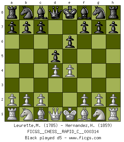 Last move : 0-1 2025 November 30 18:55:22 [Event "FICGS__CHESS__RAPID_C__000314"] [Site "FICGS"] [Date "2025.11.15"] [Round "1"] [White "Leurette,Marc-Antoine"] [Black "Hernandez,Humberto"] [Result "0-1"] [WhiteElo "1785"] [BlackElo "1859"] 1.e4 e6 2.d4 d5 3.e5 c5 4.c3 Nc6 5.Nf3 Qb6 6.b3 cxd4 7.cxd4 Bb4+ 8.Bd2 Nxd4 9.Nxd4 Qxd4 10.Bb5+ Ke7 11.O-O Bxd2 12.Nxd2 a6 13.Be2 Qxe5 14.Nf3 Qd6 15.Qd2 Bd7 16.Qg5+ Nf6 17.Ne5 h6 18.Qe3 Rhd8 19.Nxd7 d4 20.Qf3 Rxd7 21.Rfd1 Kf8 22.Bd3 Re8 23.h3 e5 24.Be4 g6 25.Rd3 Nxe4 26.Qxe4 f5 27.Qe1 e4 28.Rd2 d3 29.Qb1 f4 30.Qb2 Qe5 31.Qb1 Kg7 32.a4 e3 33.fxe3 fxe3 34.Rxd3 Rxd3 0-1 Follow this game move after move (download)Bobby Fischer is the greatest Chess genius of all time ! (Alexander Kotov) Alle Schachspieler sollten auch ein Hobby haben. (Savielly Grigorievitsch Tartakower) El Ajedrez no es una pizca de inferior al violín, y tenemos un gran número de violinistas profesionales. (Mikhail Botvinnik) Les sacrifices démontrent seulement que quelqu'un a gaffé. (Savielly Tartacover) The human is the only animal species whose members are able to talk themselves into difficulties that would not otherwise exist. (Wendell Johnson)