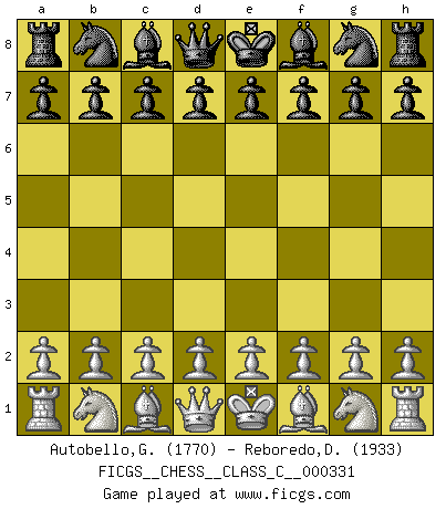 Last move : Rd8 2025 December 7 17:45:24 White clock - 39 days 18:42:58 (34 days 12:58:03) Black clock - 74 days 11:38:16 [Event "FICGS__CHESS__CLASS_C__000331"] [Site "FICGS"] [Date "2025.11.17"] [Round "1"] [White "Autobello,Giovanni"] [Black "Reboredo,Daniel"] [Result "*"] [WhiteElo "1770"] [BlackElo "1933"] 1.e4 e5 2.Nf3 Nc6 3.d4 exd4 4.Nxd4 Nf6 5.Nc3 Bb4 6.f3 O-O 7.Bc4 d5 8.Bd2 dxc4 9.O-O Qxd4+ 10.Kh1 Rd8 11.* Follow this game move after move (download)The most powerful weapon in Chess is to have the next move. (David Bronstein) Ja, ich habe einmal eine Blitzpartie gespielt, es war in einem Zug, 1929. --im Interview 1989 (Mikhail Moiseyevich Botvinik) El tablero es el mundo, las piezas es el fenomeno del universo, las reglas del juego son lo que llamamos leyes de la naturaleza y el jugador del lado opuesto, se encuentra oculto a nuestra vista. (Thomas Huxley) Même si vous avez un bon coup à faire, regardez toujours s'il n'y en a pas un qui lui soit préférable. (Pedro Damiano) The modern world has divided itself into Conservatives and Progressives. The business of Progressives is to go on making mistakes. The business of the Conservatives is to prevent the mistakes from being corrected. (G.K. Chesterton)