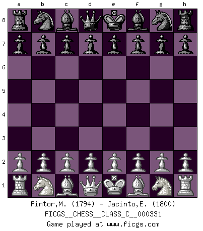 Last move : Re3 2026 January 1 17:26:12 White clock - 71 days 08:45:23 (59 days 16:22:40) Black clock - 43 days 01:19:40 [Event "FICGS__CHESS__CLASS_C__000331"] [Site "FICGS"] [Date "2025.11.17"] [Round "1"] [White "Pintor,Manuel"] [Black "Jacinto,Estefanie Grace"] [Result "*"] [WhiteElo "1794"] [BlackElo "1800"] 1.e4 e5 2.f4 exf4 3.Nf3 g5 4.Bc4 g4 5.O-O gxf3 6.Qxf3 Qf6 7.c3 d6 8.d4 Bh6 9.Nd2 Ne7 10.Qh5 Qg6 11.Qh4 Rg8 12.Qf2 Bh3 13.g3 Nd7 14.Re1 fxg3 15.hxg3 Qxg3+ 16.Qxg3 Rxg3+ 17.Kh2 Bf4 18.Nf1 Re3 19.* Follow this game move after move (download)Blessed be the memory of him who gave the world this immortal game. (A. G. Gardiner) Ich verstehe den Grund nicht, warum die Aufteilung in Frauen und Männer überhaupt im Schach besteht. (Judith Polgar) Los tropiezos estan todos ahí en el tablero, esperando que se cometan. (Savielly Tartakover) Les ravages du H expliquent la différence de niveau entre Tal et Thal [Abergel]. Art is the triumph over chaos. (John Cheever)