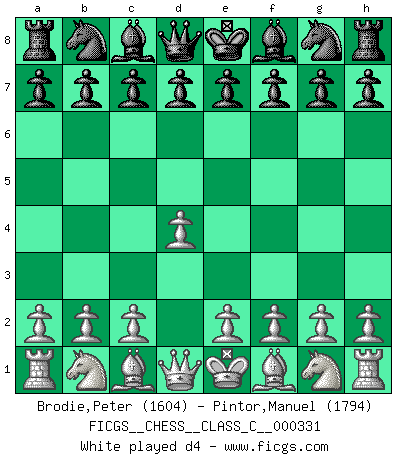 Last move : Nxd6 2025 December 27 3:59:5 White clock - 0 day 16:29:15 Black clock - 33 days 17:38:01 [Event "FICGS__CHESS__CLASS_C__000331"] [Site "FICGS"] [Date "2025.11.17"] [Round "1"] [White "Brodie,Peter"] [Black "Pintor,Manuel"] [Result "*"] [WhiteElo "1604"] [BlackElo "1794"] 1.d4 d5 2.Nf3 Nc6 3.Bf4 Nf6 4.Nc3 Bf5 5.e3 e6 6.Bd3 Ne4 7.O-O f6 8.Nb5 Bd6 9.Nxd6+ Nxd6 10.* Follow this game move after move (download)With or without the title, Bobby Fischer was unquestionably the greatest player of his time. (Burt Hochberg) In der Schule lernt man nichts. Es ist nur Zeitverschwendung. (Robert James Fischer) Combinaciones deslumbrantes son para la mayoría, mover madera es para los pocos. (Georg Kieninger) Les échecs sont utiles à l'exercice de la faculté de penser et à celle de l'imagination. Car nous devons posséder une méthode élaborée pour atteindre des buts partout où nous devons conduire notre raison. (Leibnitz) Gambling is the son of avarice and the father of despair. (French proverb)