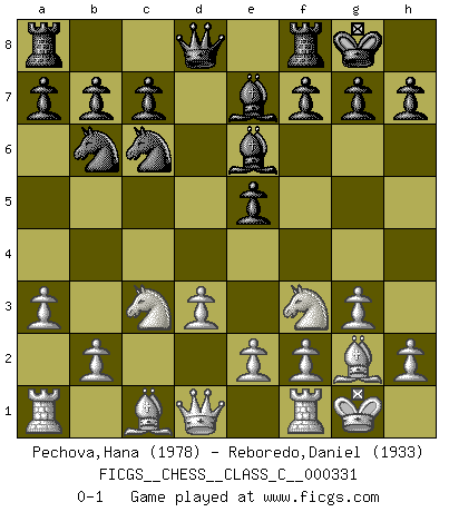 Last move : 0-1 2025 December 31 10:37:39 [Event "FICGS__CHESS__CLASS_C__000331"] [Site "FICGS"] [Date "2025.11.17"] [Round "1"] [White "Pechova,Hana"] [Black "Reboredo,Daniel"] [Result "0-1"] [WhiteElo "1978"] [BlackElo "1933"] 1.c4 e5 2.Nc3 Nf6 3.Nf3 Nc6 4.g3 d5 5.cxd5 Nxd5 6.Bg2 Nb6 7.O-O Be7 8.d3 O-O 9.a3 Be6 0-1 Follow this game move after move (download)When you absolutely don't know what to do anymore, it is time to panic. (John van der Wiel) Später, ... hatte ich zunehmend Erfolg in entscheidenden Partien. Vielleicht weil ich eine einfache Wahrheit erkannte: nicht nur ich hatte Angst, auch mein Gegner. (Mikhail Nekhemyevich Tal) Sin errores no puede haber brillantez. (Emanuel Lasker) Il n'y a plus de joueurs du niveau de Jacob Murray dont la seule quête est le beau jeu, le plaisir de voir les pièces construire quelque chose. Sur 10 idées à la minute, 9 seront sans intérêt, la dernière s'avèrera géniale. (Christian Bauer) A specialist learns more and more about less and less until he knows everything about nothing. (Nicholas Murray Butler)