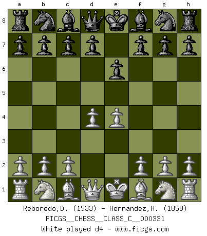 Last move : 1/2-1/2 2025 November 24 9:13:50 [Event "FICGS__CHESS__CLASS_C__000331"] [Site "FICGS"] [Date "2025.11.17"] [Round "1"] [White "Reboredo,Daniel"] [Black "Hernandez,Humberto"] [Result "1/2-1/2"] [WhiteElo "1933"] [BlackElo "1859"] 1.e4 e6 2.d4 d5 3.Nc3 Nf6 4.Bg5 Bb4 5.e5 h6 6.exf6 hxg5 7.fxg7 Rg8 8.h4 gxh4 9.Qh5 Qf6 10.Nf3 Qxg7 11.Qxh4 a6 12.O-O-O Nc6 13.Qf4 Bd6 14.Qe3 Be7 15.g3 Bd7 16.Bd3 1/2-1/2 Follow this game move after move (download)The game of chess is the touchstone of the intellect. (Goethe) Es war undenkbar für die Behörden, dass ein sowjetischer Großmeister auf diese Art und Weise [Fischer-Taimanov 6:0] verliert, ohne dass es eine politischer Erklärung dafür gäbe. (Mark Taimanov) El Ajedrez es un juego terrible. Si no dominas el centro, tu oponente tiene una posición mas libre. Si tu tienes el centro, entonces realmente tienes algo de que preocuparte. (Siegbert Tarrasch) Je menace de comprendre la position. (Anonyme) Thus, what is of supreme importance in war is to attack the enemy's strategy. (Sun Tzu)